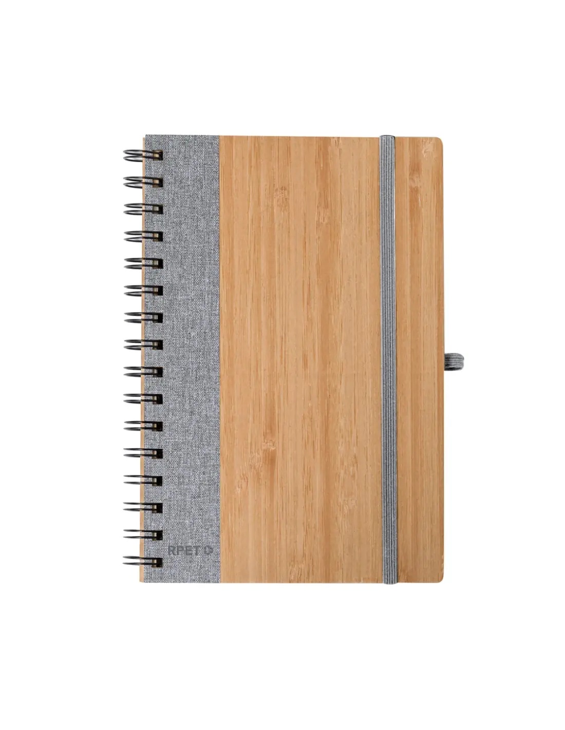 Libreta de anillas con tapas rígidas de bambú. Incluye 80 hojas con disposición a una raya de papel reciclado. Con cierre elástico, banda lateral, y soporte para bolígrafo a juego. Disponible en variada gama de colores, presentada individualmente en bolsa de papel reciclado. Materiales como el bambú fomentan la utilización de materias primas naturales, reduciendo las emisiones contaminantes. Proviene de una planta de gran resistencia y versatilidad, con crecimiento y regeneración rápidos, siendo una excelente alternativa al uso de madera tradicional.