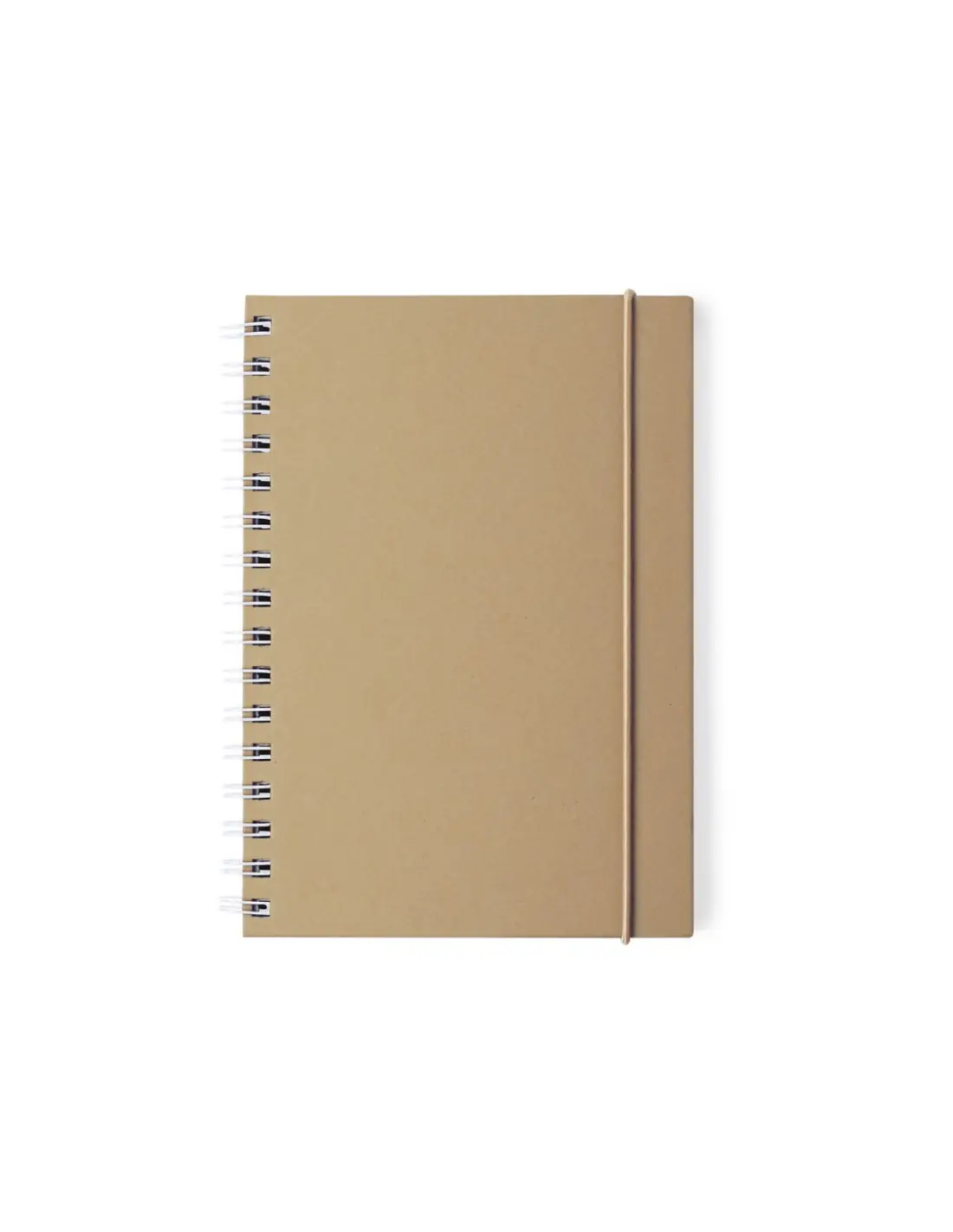Libreta con anillas de color en línea nature. Con tapas rígidas en cartón reciclado y elástico de cierre en colores naturales. Con 80 hojas de disposición a una raya y diseño eco.