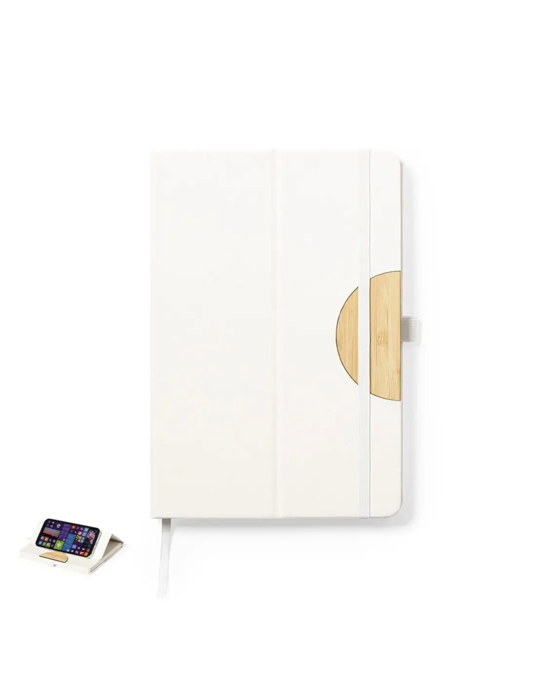 Libreta de línea nature convertible en soporte para smartphone y fabricada con cartones de leche reciclados. Tapas duras, con detalle en bambú en la...