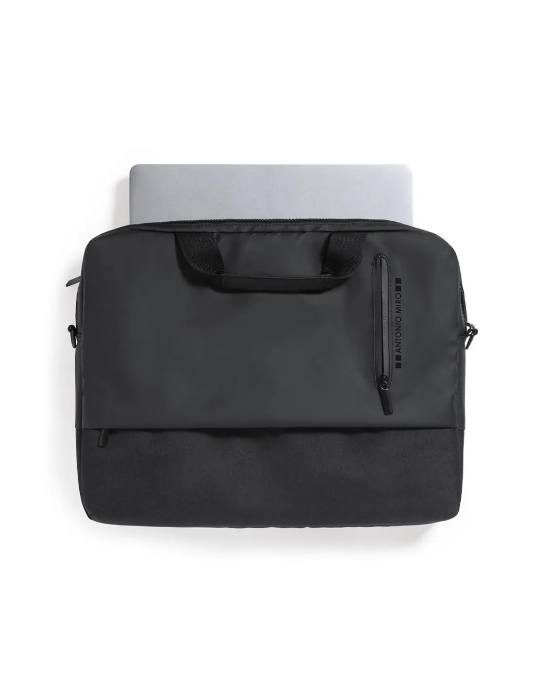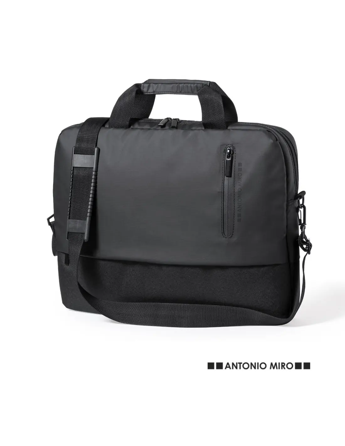 Maletín de Antonio Miró de calidad premium en resistente poliéster 600D. De sobrio diseño y con compartimento acolchado para portátil de hasta 15 pulgadas. Con cómoda asa de transporte reforzada, cierres de cremallera con tiradores metálicos y bolsillo frontal. Logotipo de la marca en frontal.