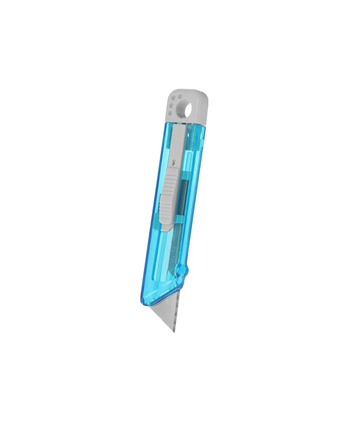 Cúter en PS de acabado translúcido. Con un mecanismo pulsador de retracción automática y una hoja de acero de 6 x 1,9 cm, sin sistema de bloqueo (stopper).