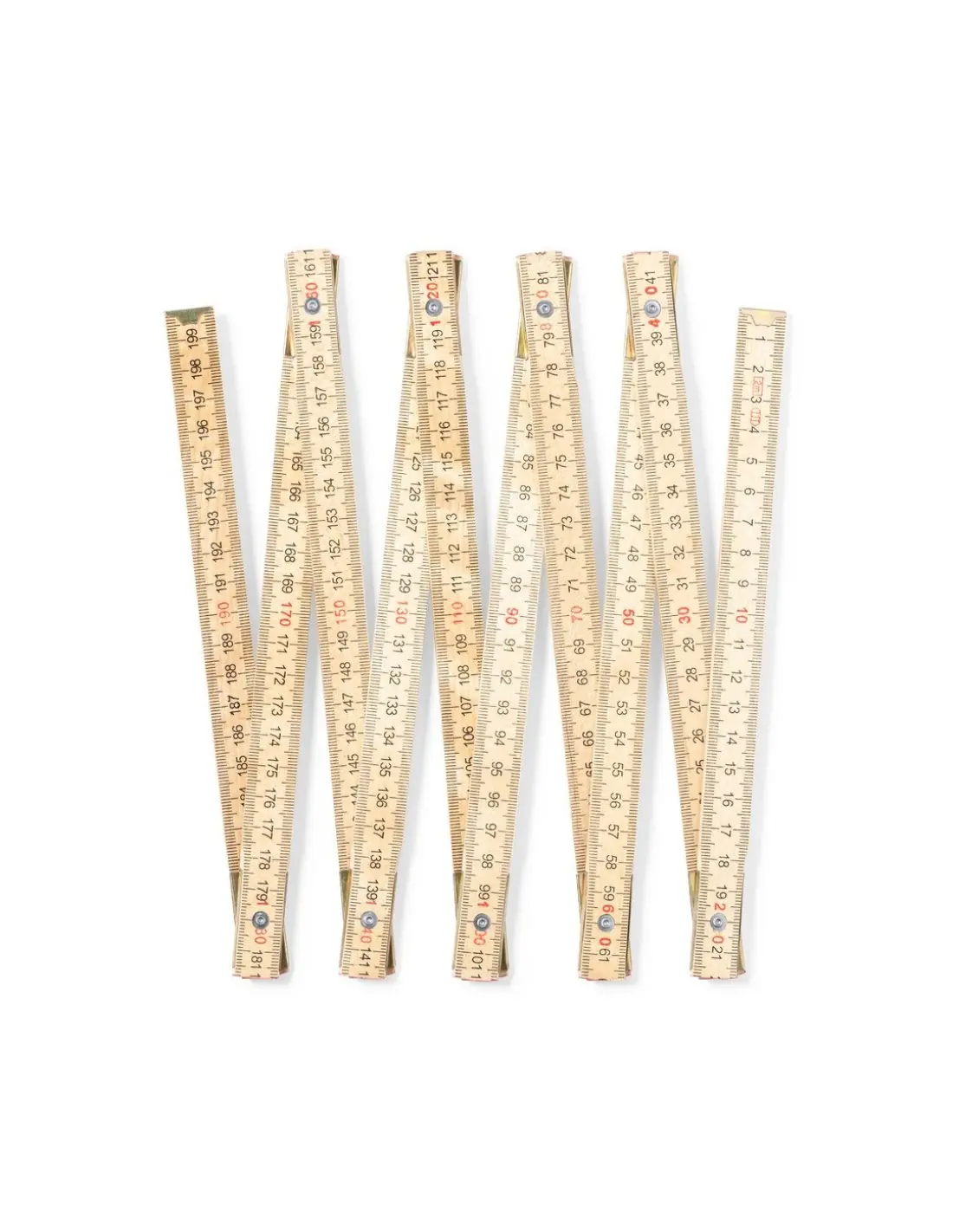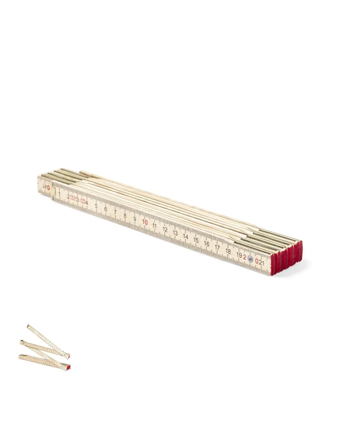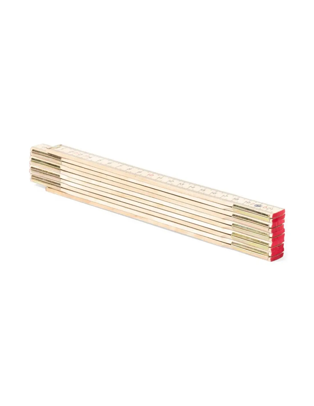 Clásica regla de carpintero fabricada en madera natural. Plegabe, con 10 segmentos y de 2 m de longitud.