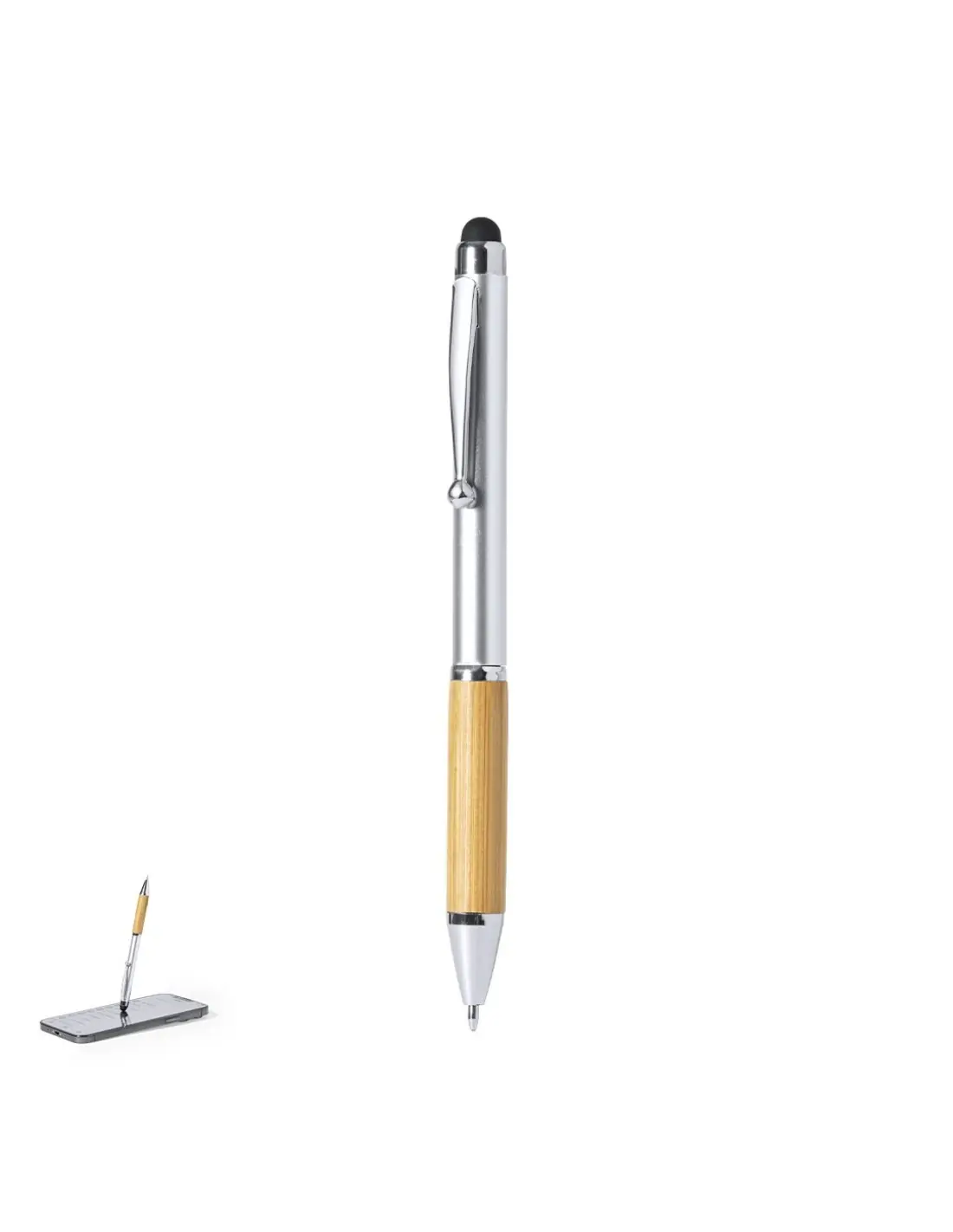 Elegante bolígrafo puntero de línea nature y mecanismo giratorio. Cuerpo en resistente ABS de acabado brillo y empuñadura en bambú, con accesorios a...