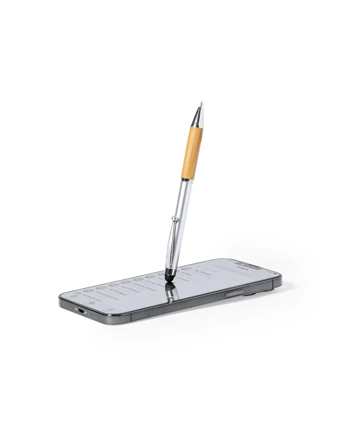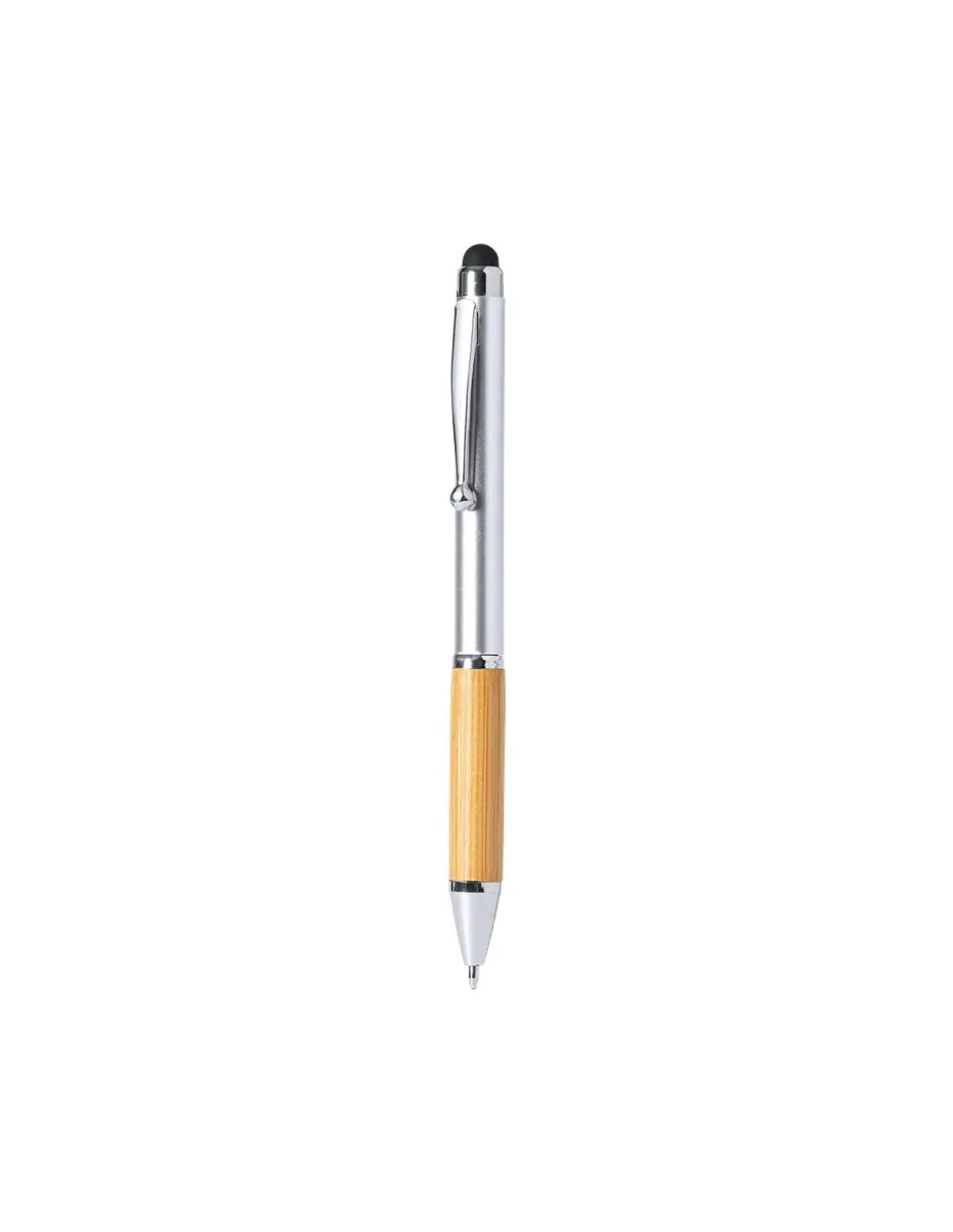 Elegante bolígrafo puntero de línea nature y mecanismo giratorio. Cuerpo en resistente ABS de acabado brillo y empuñadura en bambú, con accesorios a juego. Clip metálico y en tinta azul.