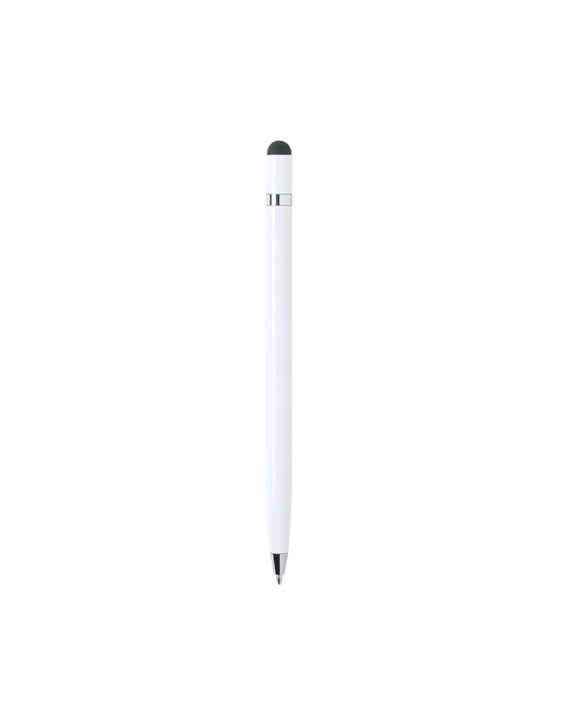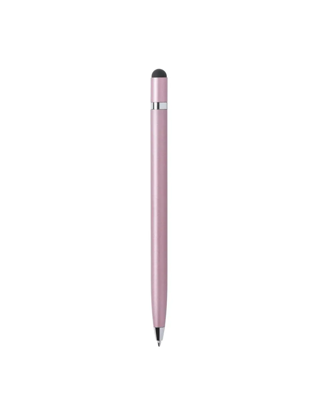 Bolígrafo puntero de mecanismo giratorio con cuerpo en aluminio de suave acabado metalizado. Con anilla cromada. Colores dorado, rosa, plateado y grafito con acabado brillo y color blanco con acabado mate. Tinta azul.