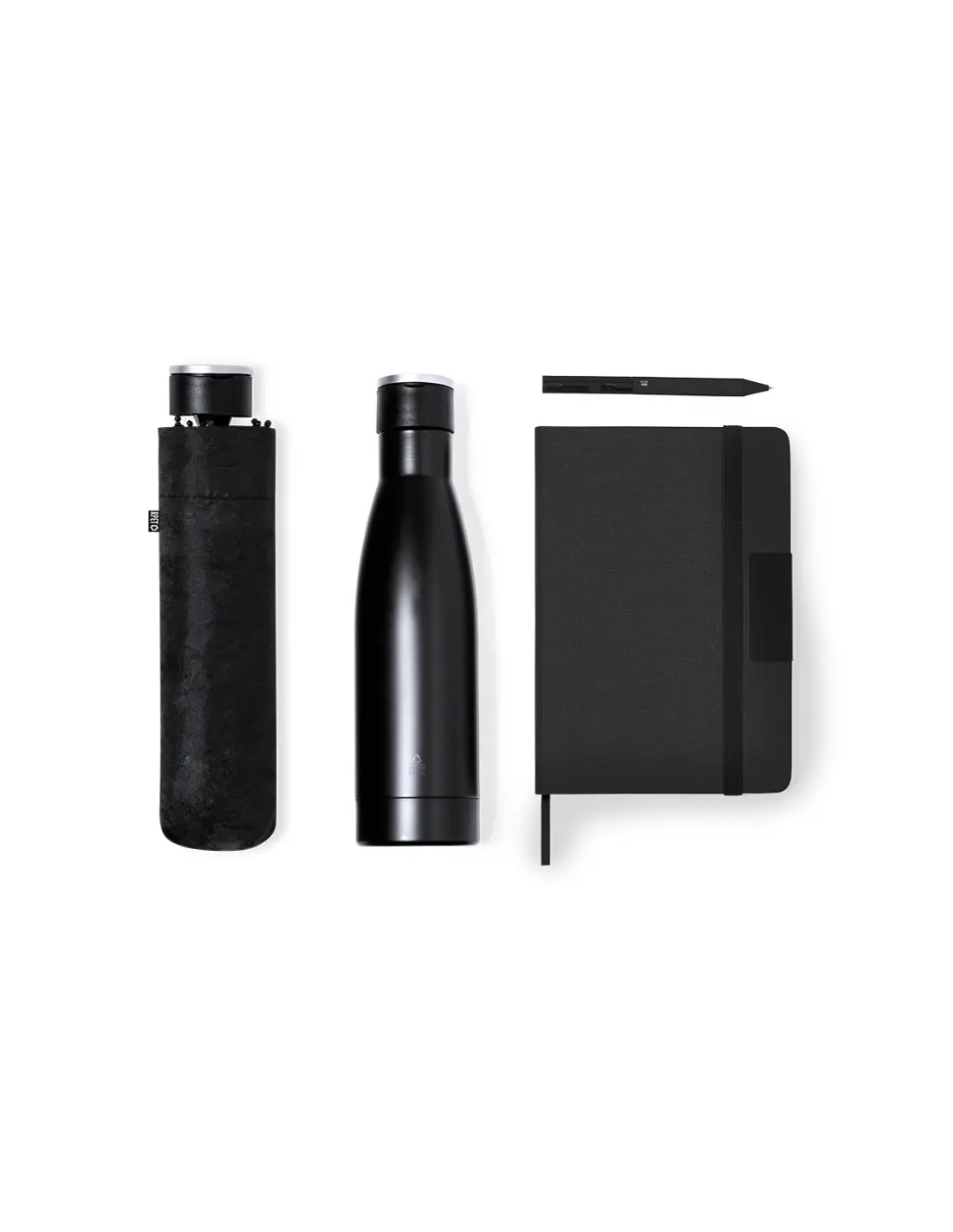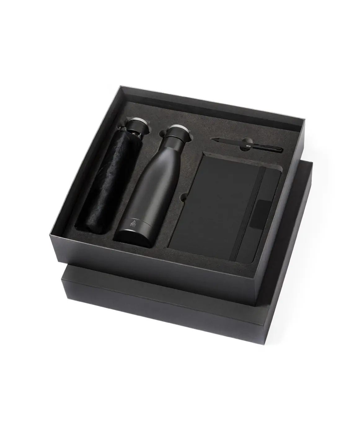 Elegante set premium que incluye:Termo de doble capa en acero inoxidable reciclado de acabado negro mate y de 500 ml de capacidad, con asa rígida de metal color plata mate. Con distintivo acero inoxidableBloc de notas en RPET en elegante color negro, con detalle metálico especial para marcaje en láser. Incluye cierre elástico y marcapáginas de tela. Interior con 80 hojas de disposición a una raya. Con distintivo RPETParaguas plegable de color negro con 98cm de diámetro. En material pongee 190T RPET. De apertura manual, con sistema anti viento y varillas fibra de vidrio. Con funda de transporte y cintas a juego. Con etiqueta distintiva RPET.Bolígrafo en RPET de acabado negro mate, de mecanismo giratorio y tinta azul. El material RPET se elabora a partir de plástico reciclado, para así fomentar la reutilización de residuos plásticos y ayudar a la sostenibilidad del planeta. Set presentado en estuche individual de acabado mate, con troquelado interior para cada uno de los elementos del set.