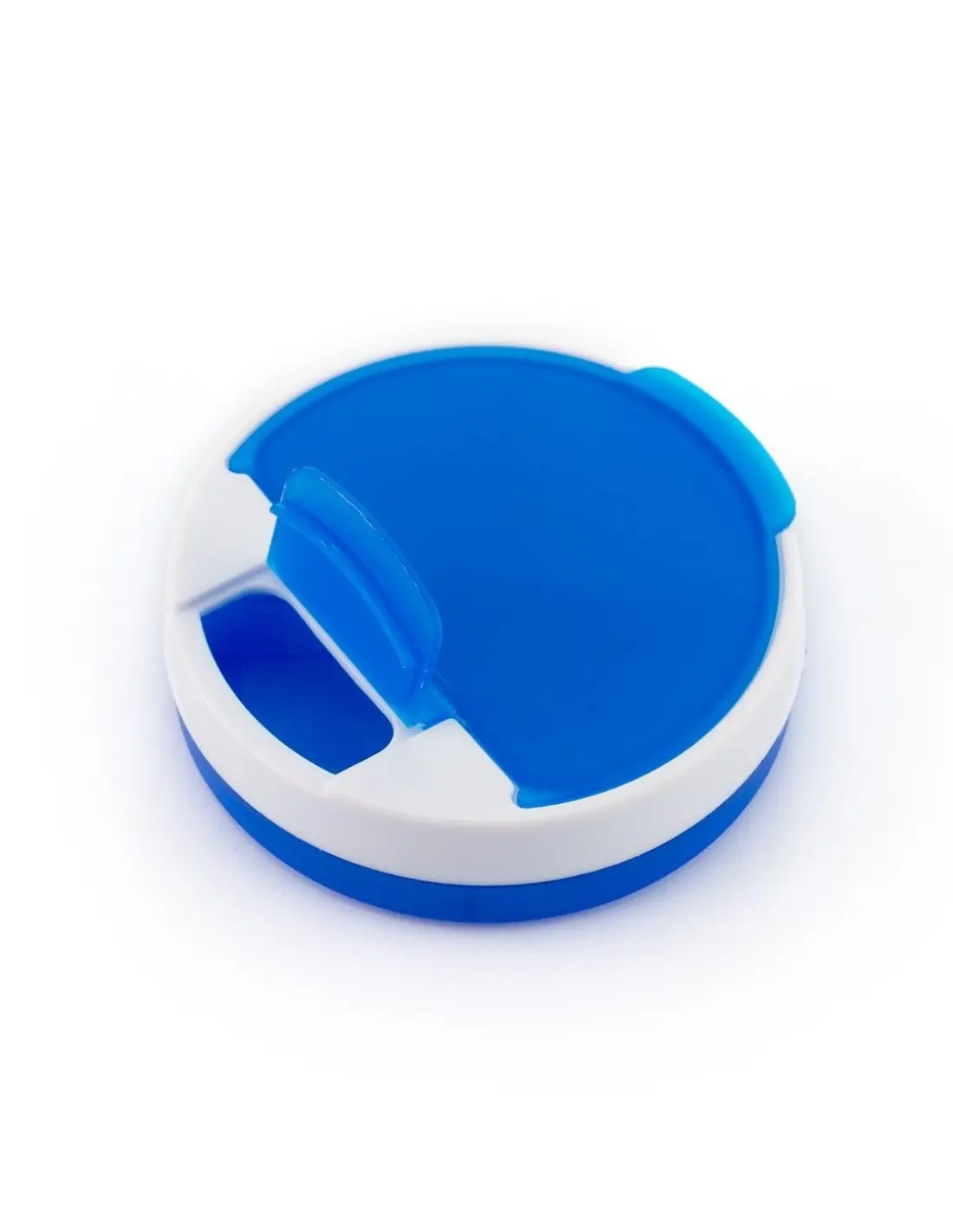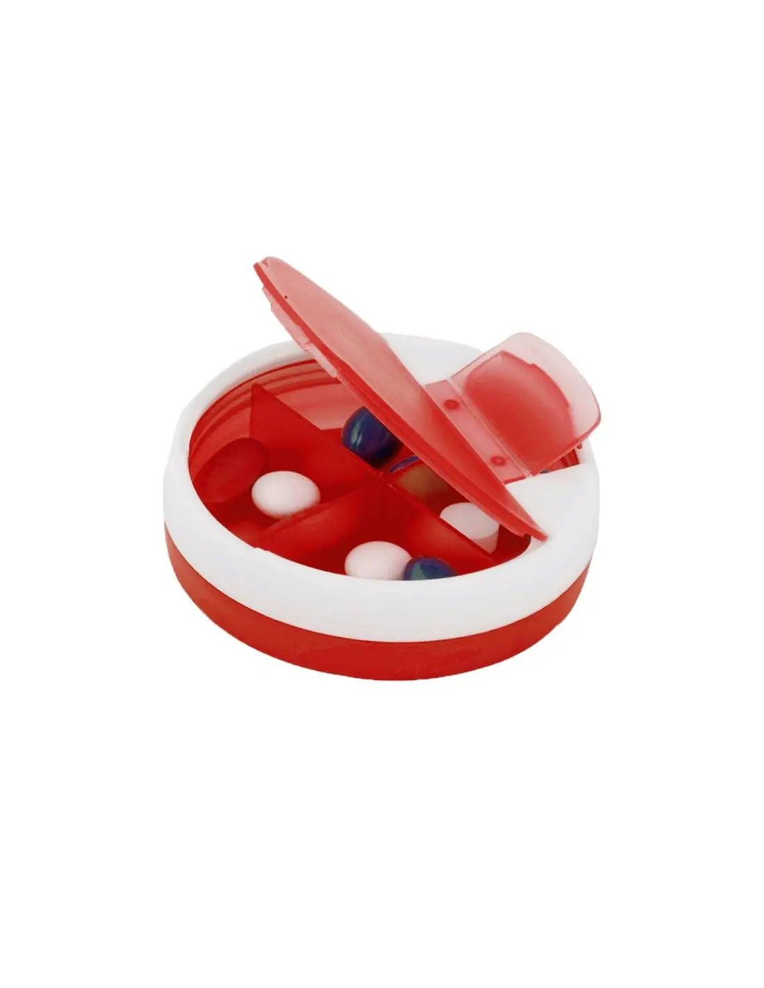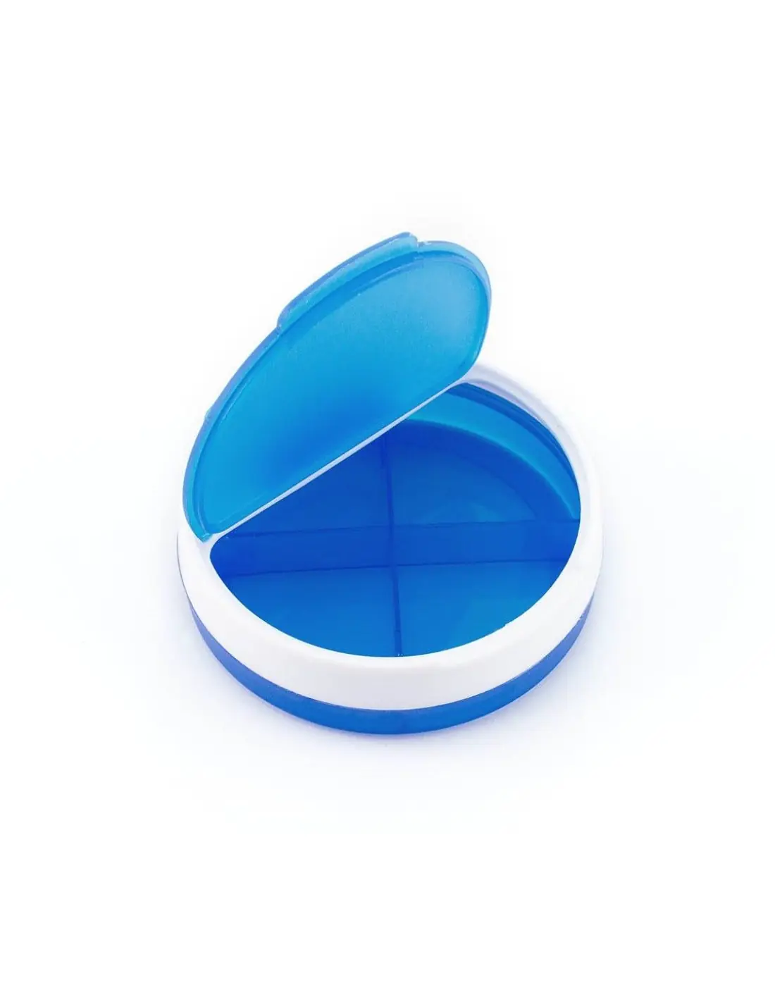 Original pastillero en diseño bicolor con tapa dispensadora de pastillas y 4 compartimentos interiores.
