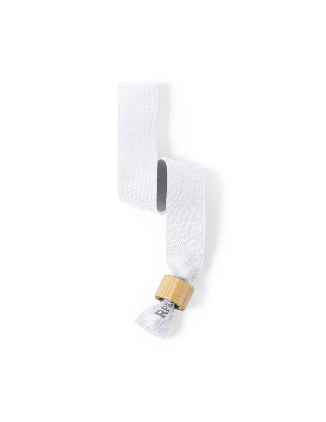Pulsera para eventos de línea nature. Fabricada en poliéster RPET de 160g/m2, elaborado a partir de plástico reciclado para así fomentar la reutilización de residuos plásticos y contribuir a la sostenibilidad del planeta. Con ajustador en bambú y disponible en variada gama de colores, color blanco especialmente diseñado para sublimación. Distintivo RPET impreso en la pulsera.
