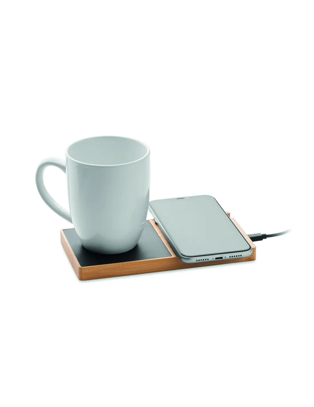 Cargador inalámbrico de bambú que incluye un calentador de tazas y un soporte para el teléfono. Conecta el dispositivo al ordenador, coloca el smartphone sobre él y deja que se cargue. Salida: CC 9V/1,67A (15W). Compatible con los últimos Android, iPhone® 8, X y recientes.