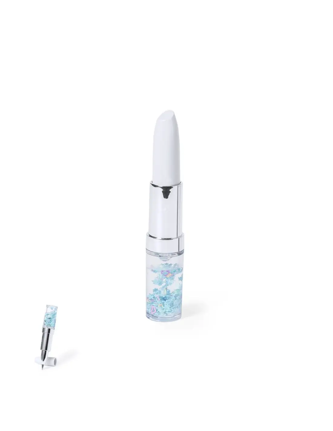 Original bolígrafo en forma de pintalabios, con líquido interior en colorido diseño. Con capucha y en tinta azul.