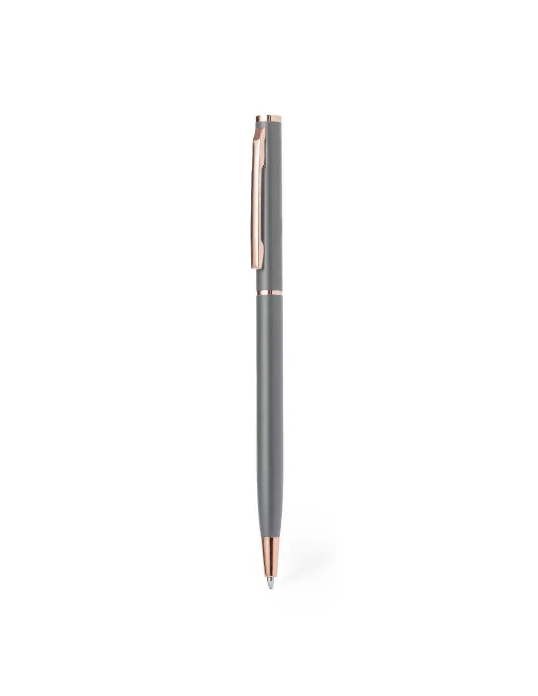 Excelente bolígrafo de aluminio con mecanismo giratorio. Cuerpo en resistente aluminio de acabado mate con elementos decorativos de elegante acabado color cobre, con la caña en una amplia gama de distintivos colores. Clip metálico y de tinta azul. Presentado en una bolsa individual reciclada.