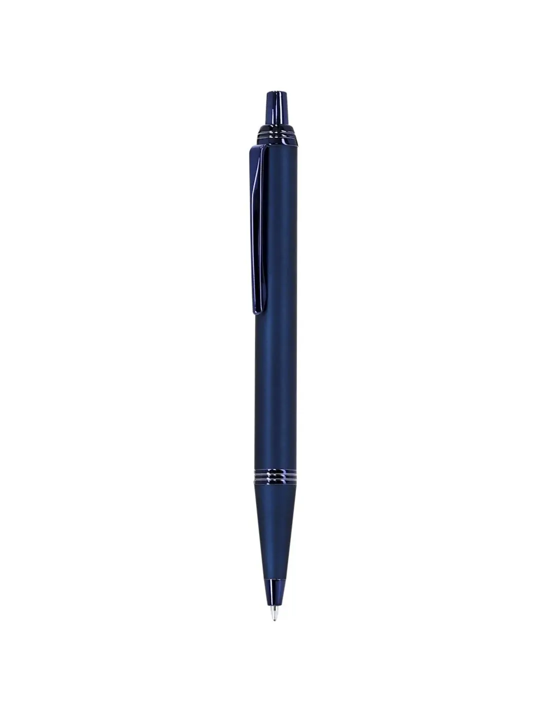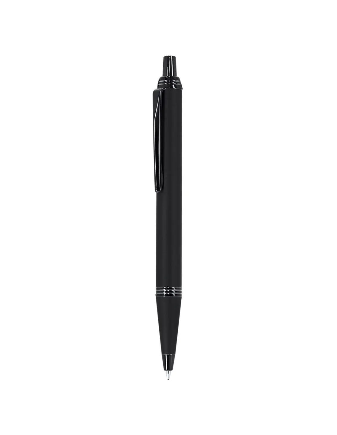 Bolígrafo con cuerpo en aluminio, acabado gomoso y detalles cromados. De mecanismo pulsador, con cartucho jumbo y tinta azul.