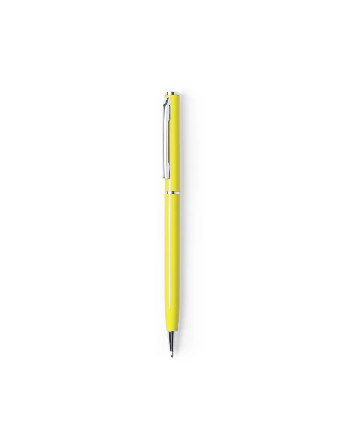 Bolígrafo fabricado en aluminio, de acabado brillo y mecanismo giratorio, con accesorios y anillas en cromado. Disponible en extensa gama de colores, con tinta azul.