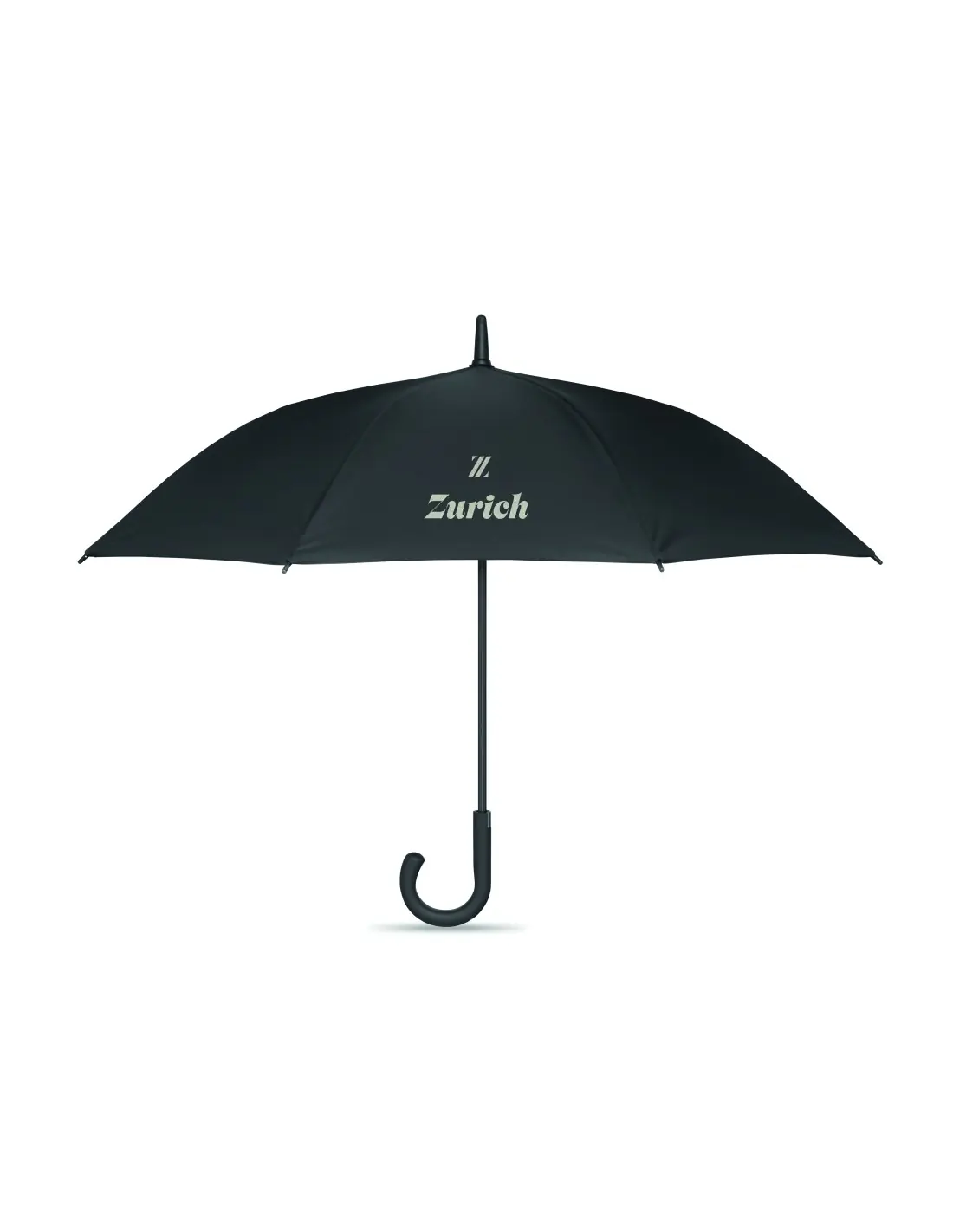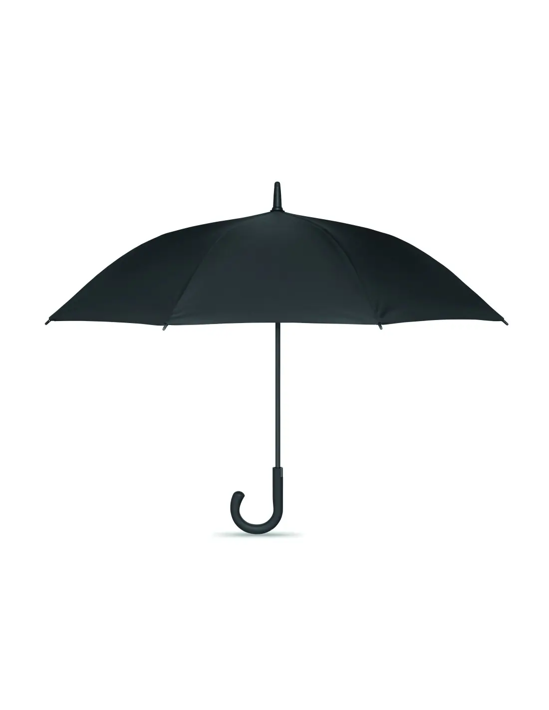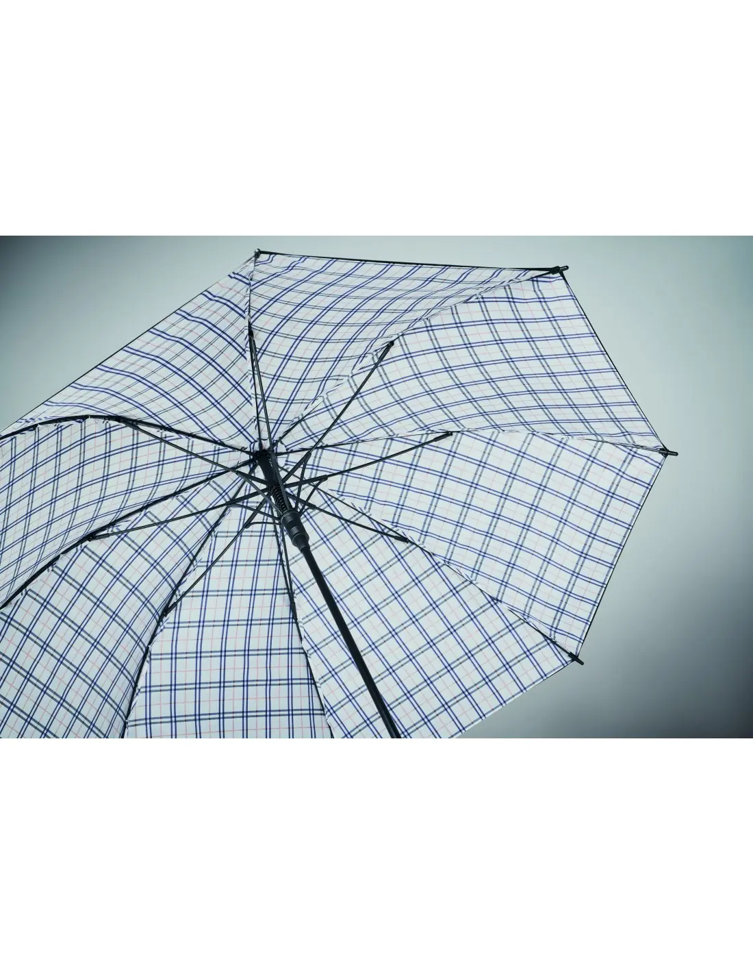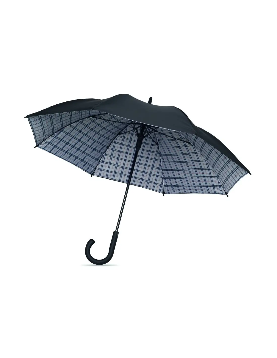 Paraguas de 23'' antiviento y de apertura automática en pongee 190T con diseño interior a cuadros. Estructura de fibra de vidrio con eje chapado en negro y puntas de plástico. Mango curvado acabado en goma. Cierre manual.