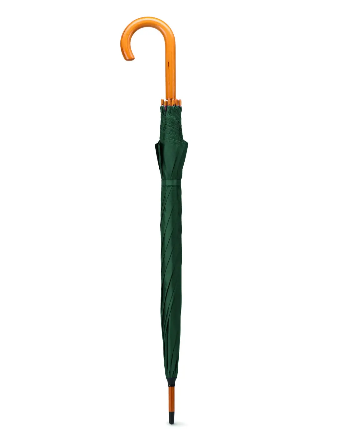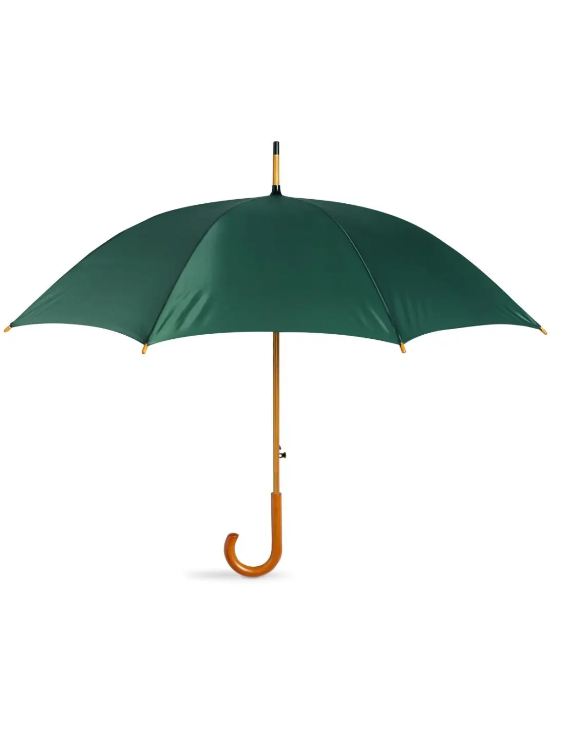 Paraguas de 23 inch. Apertura automatica. Fabricado en poliéster 190T con eje y puntas de madera. Costillas chapado metálico negro. Mango curvado de madera acabado natural. Cierre manual.