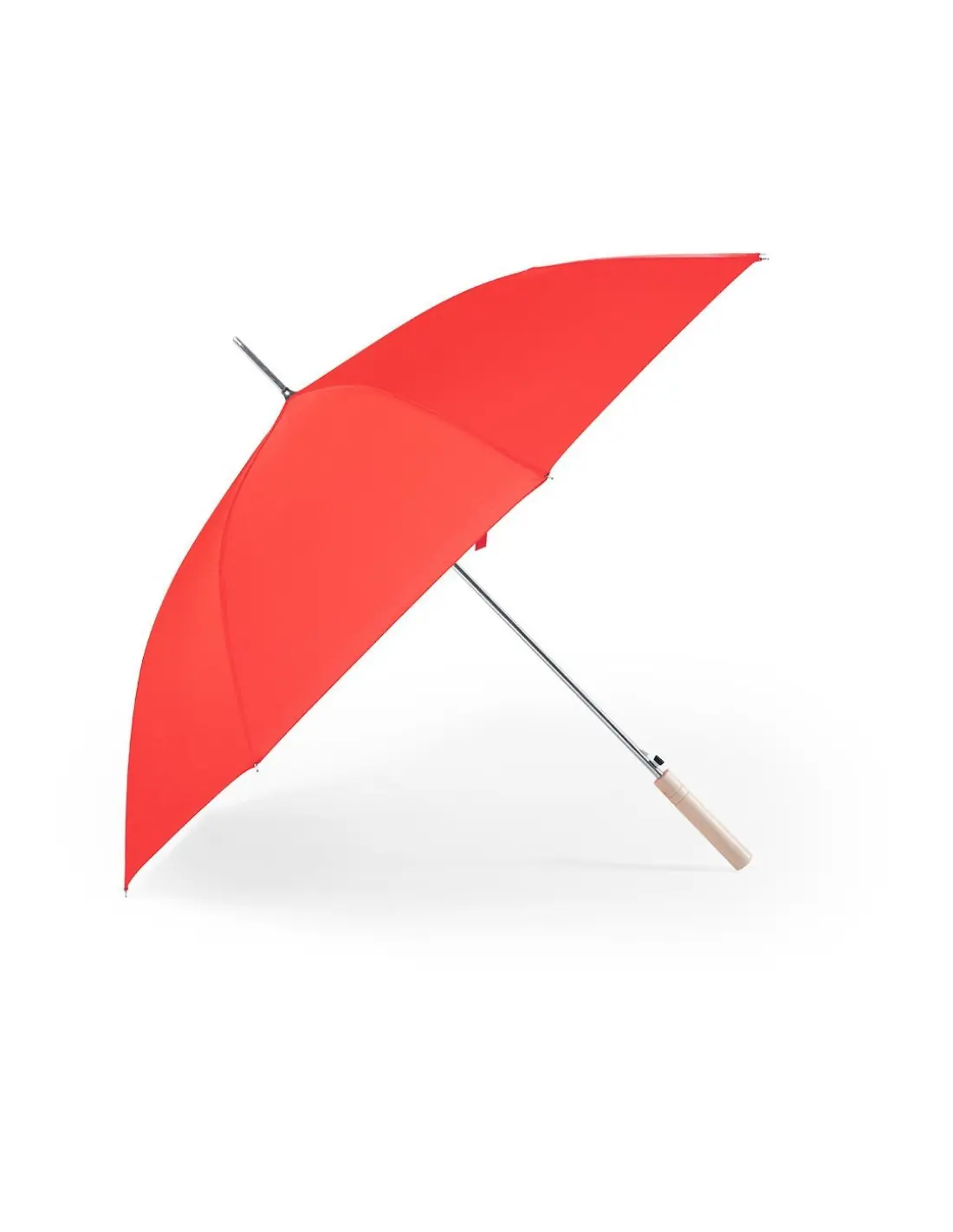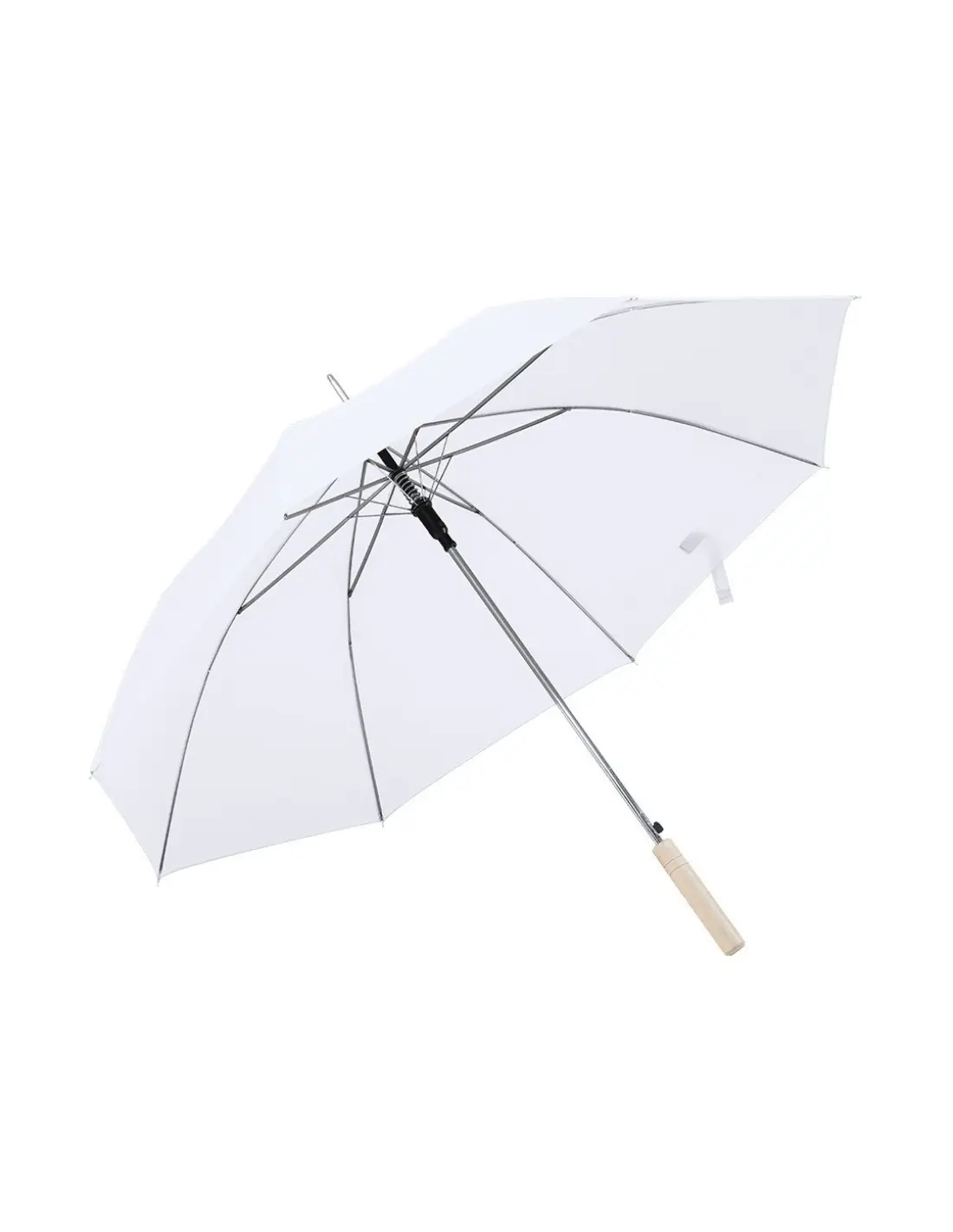 Paraguas de 8 paneles en nylon 190T, de 105 cm de diámetro. Apertura automática, con varillas metálicas en color cromado y mango de madera. Disponible en variada gama de colores planos o combinaciones con blanco.