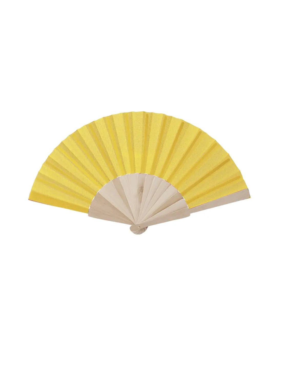 Abanico de línea nature con varillas fabricadas en resistente madera de acabado natural. Tela en resistente poliéster 190T, disponible en variada gama de colores y presentado en una caja de cartón individual blanca.