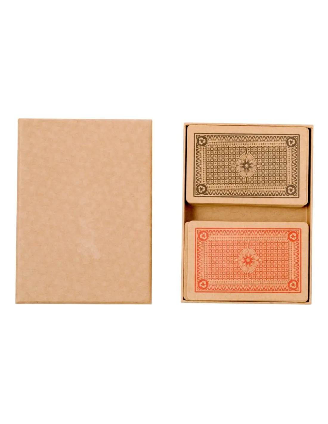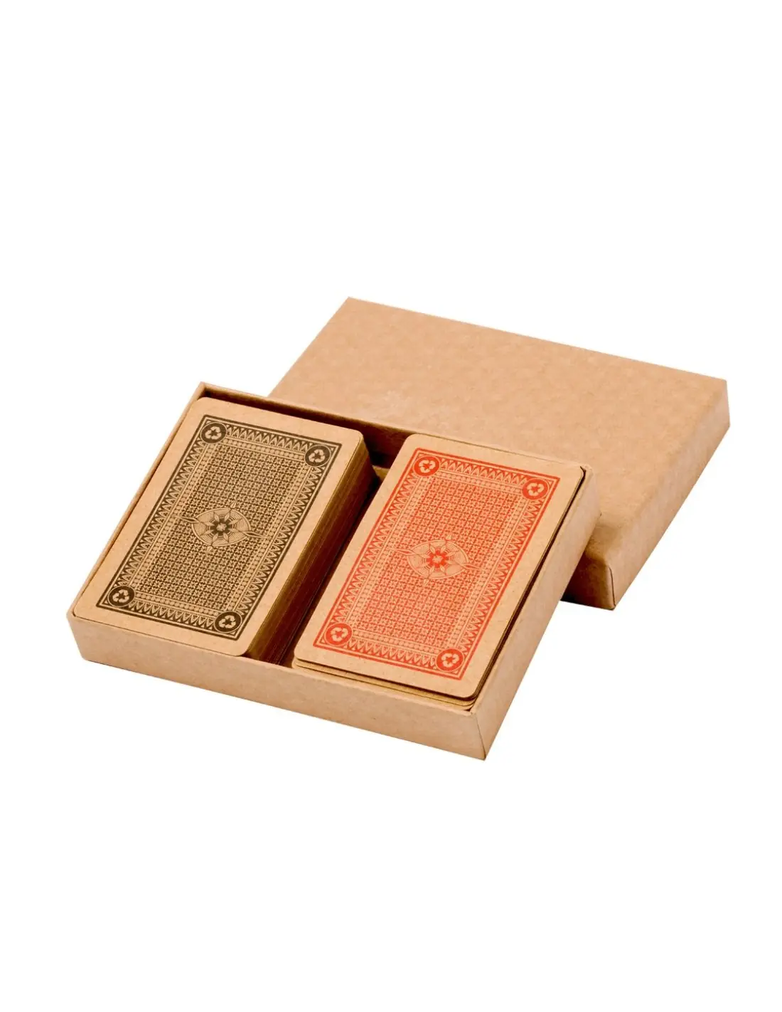 Set de baraja española y baraja francesa, fabricadas en resistente cartón reciclado. Baraja española con 50 naipes y baraja francesa con 54 naipes, presentadas en estuche de cartón acabado kraft con tapadera.