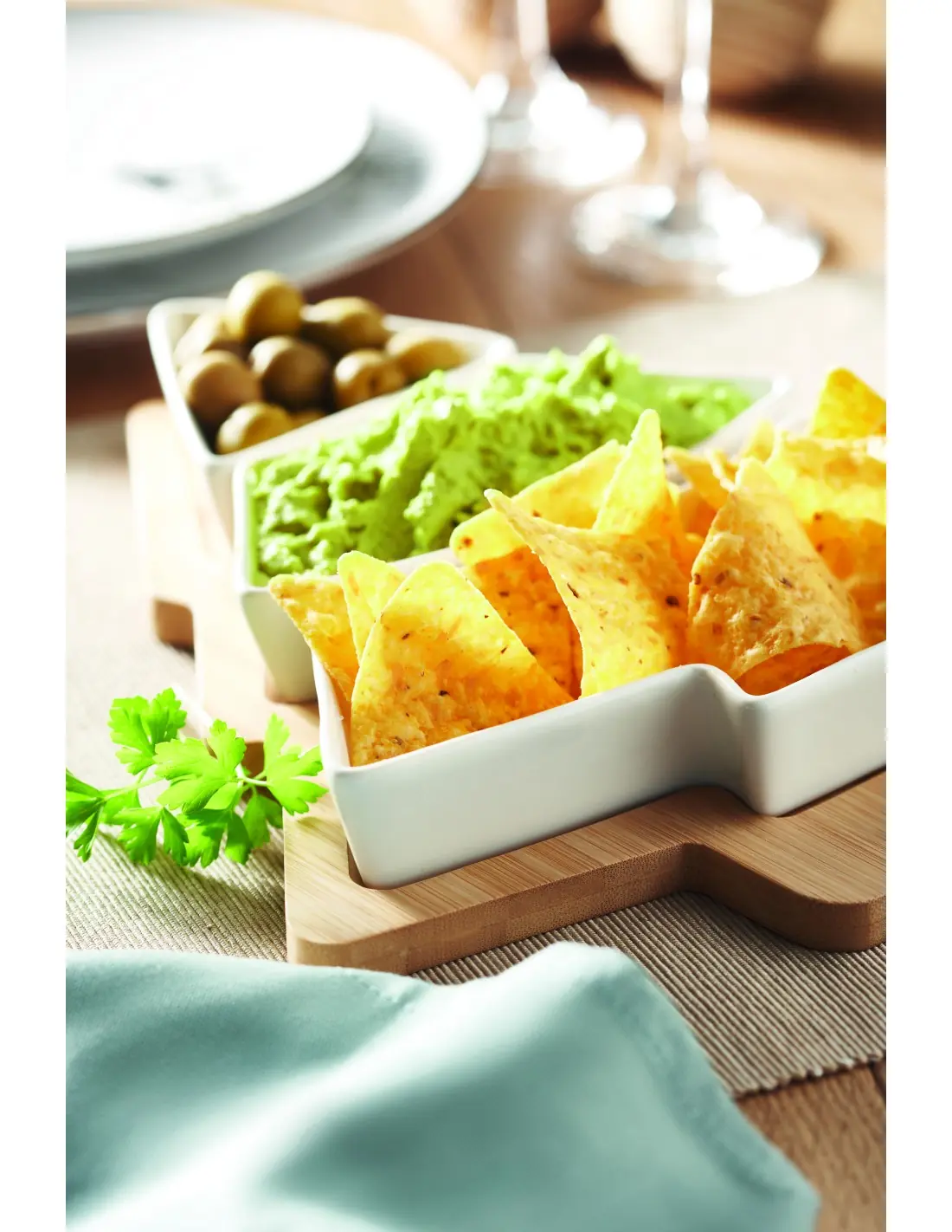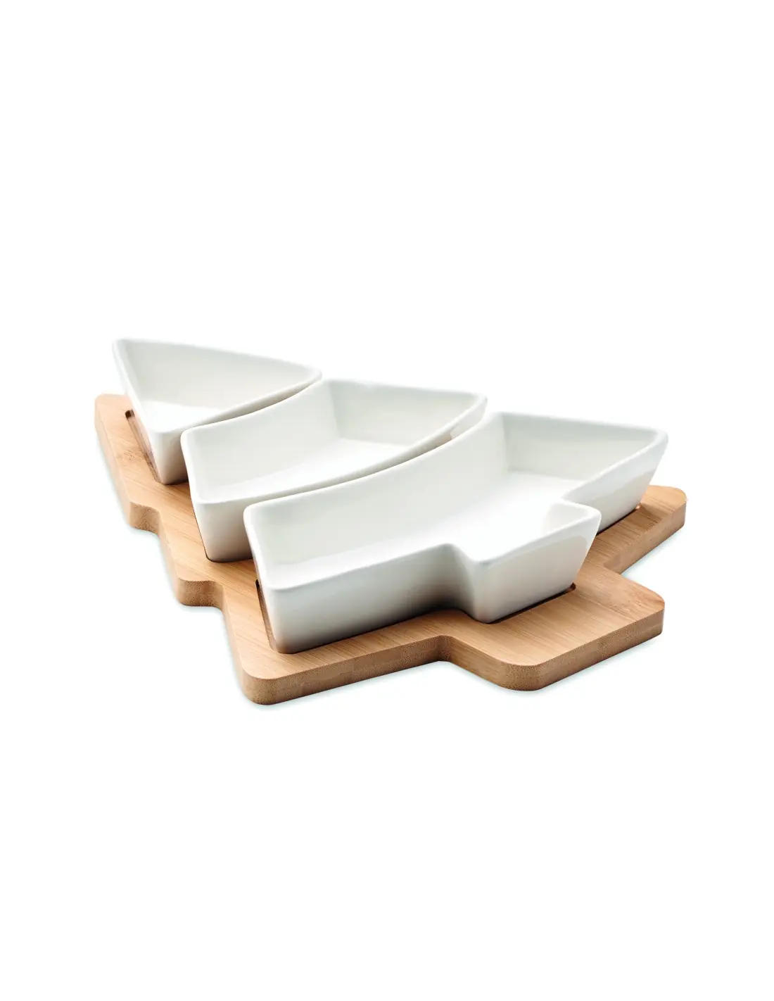 Bandeja de bambú en forma de árbol con tres platos de cerámica para servir. El bambú es material natural, el color del articulo puede variar.
