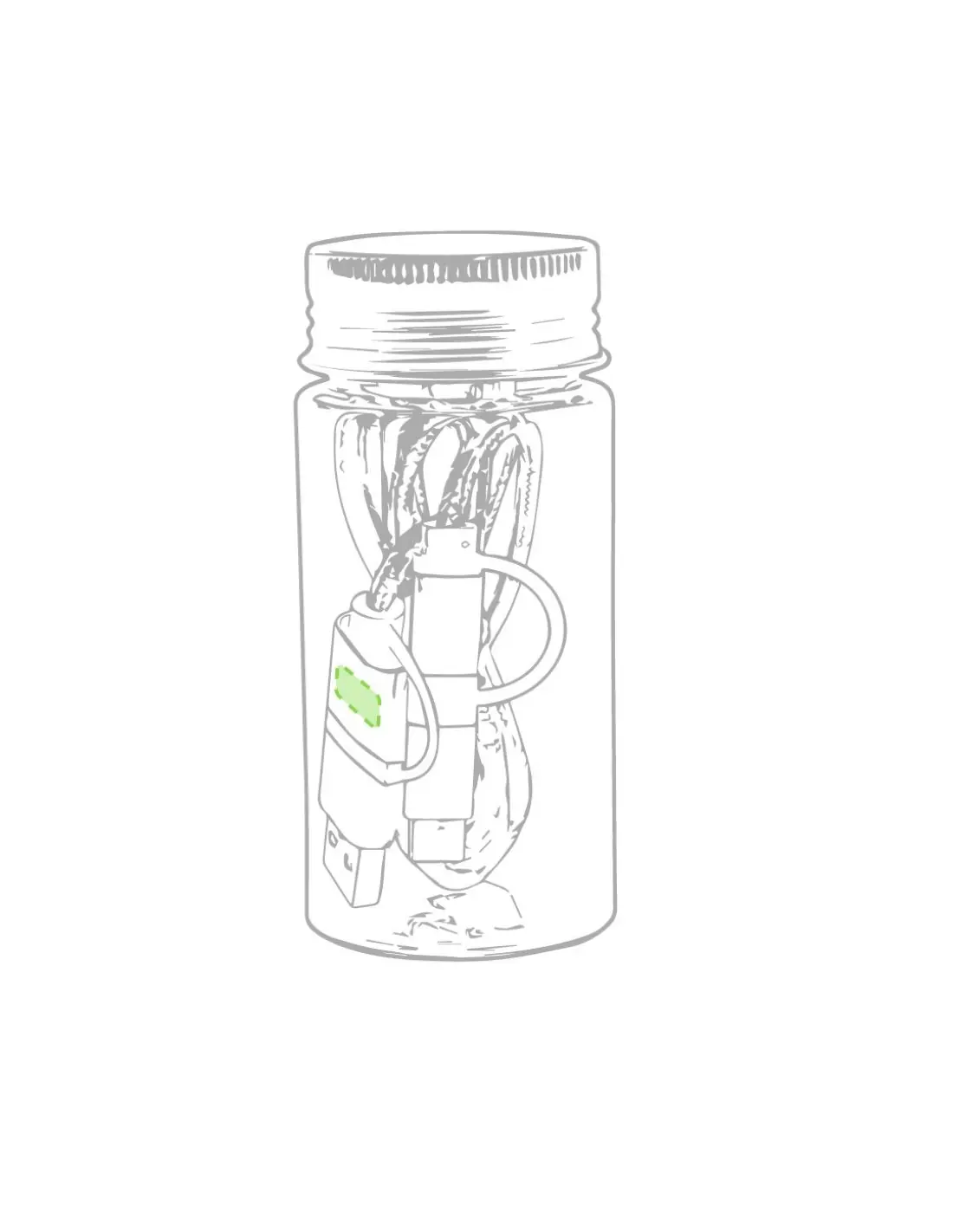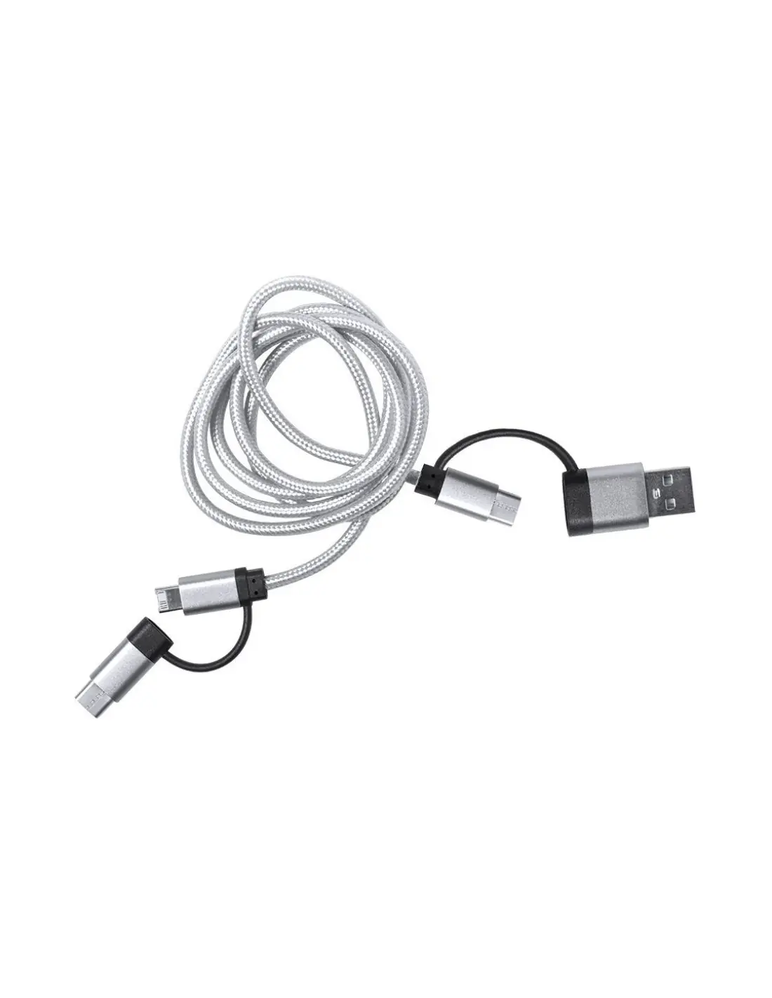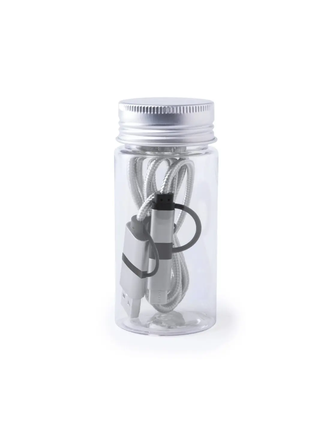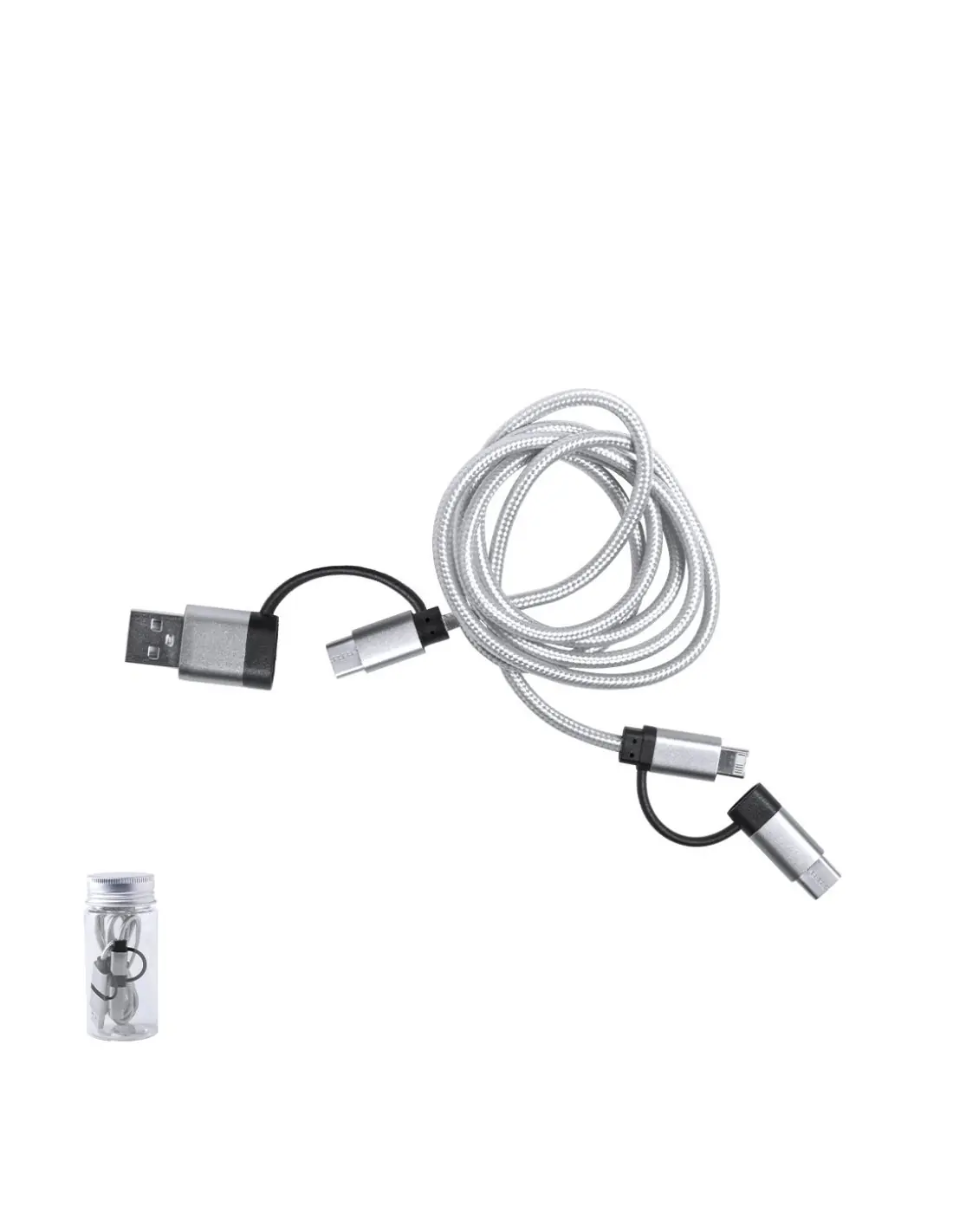 Cable cargador con conexión dual micro USB/Lightning y tipo C (entrada y salida). De 100cm de longitud, con conectores de aluminio y especialmente diseñado para marcaje en láser. Presentado en atractivo bote transparente con tapa a rosca.