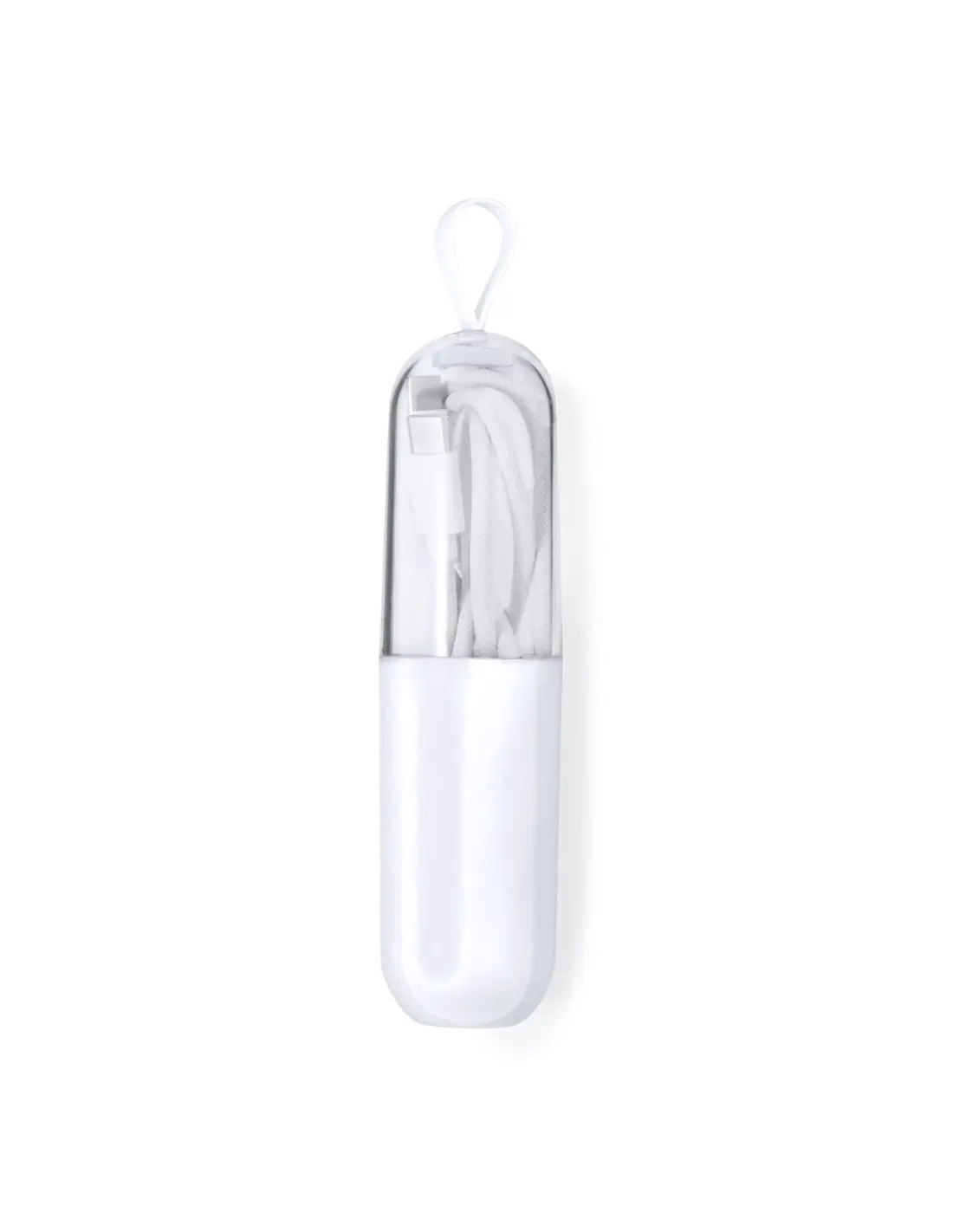 Cable cargador con conexión dual Tipo C. De 65W de potencia y apto para transferir datos. 100cm de longitud, con conectores de aluminio y presentado en atractivo estuche con una parte transparente y otra opaca. Con asa de transporte y presentado individualmente en bolsa reciclada.