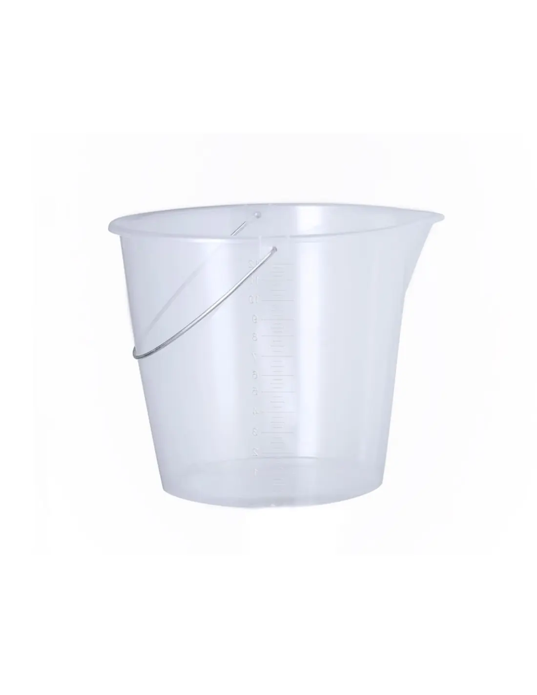 Cubo de 11L fabricado en resistente PP transparente. Con asa metálica y medidor lateral en ml para una rápida y fácil visualización. De perfil redondeado y con vertedor para evitar derrames, además de una amplia zona de marcaje.
