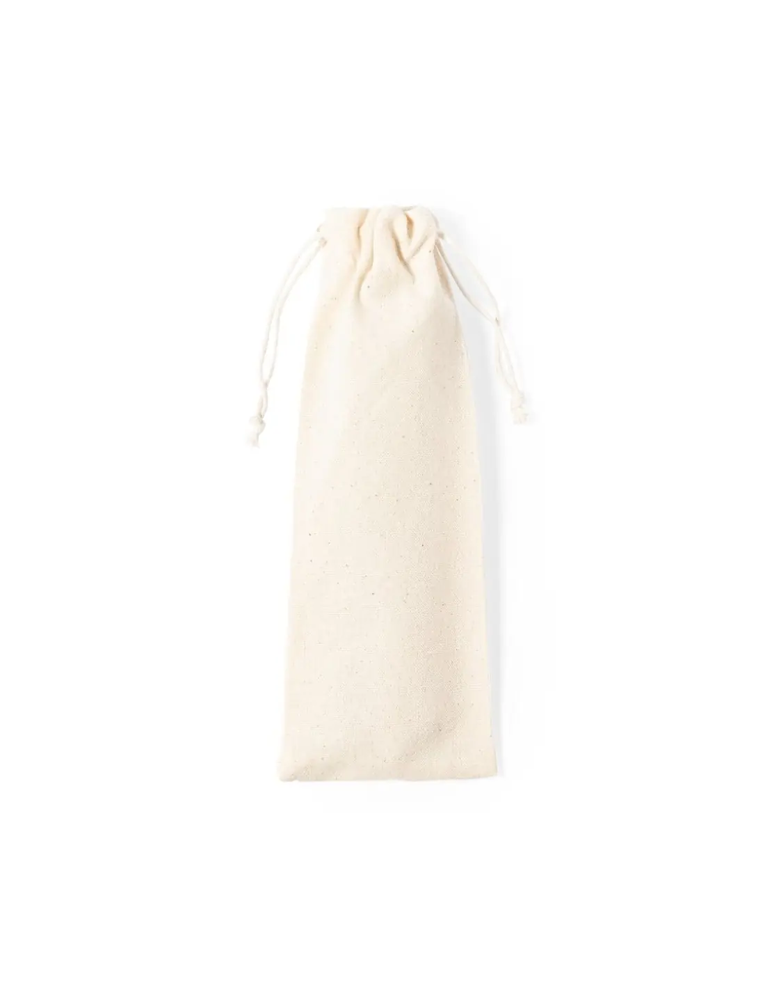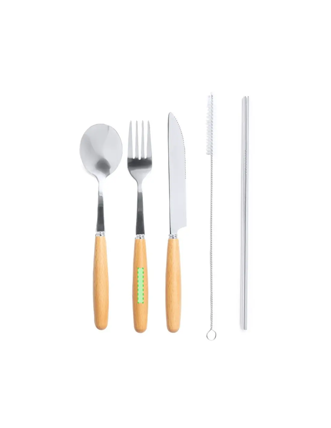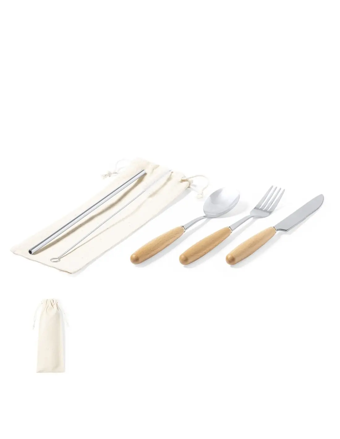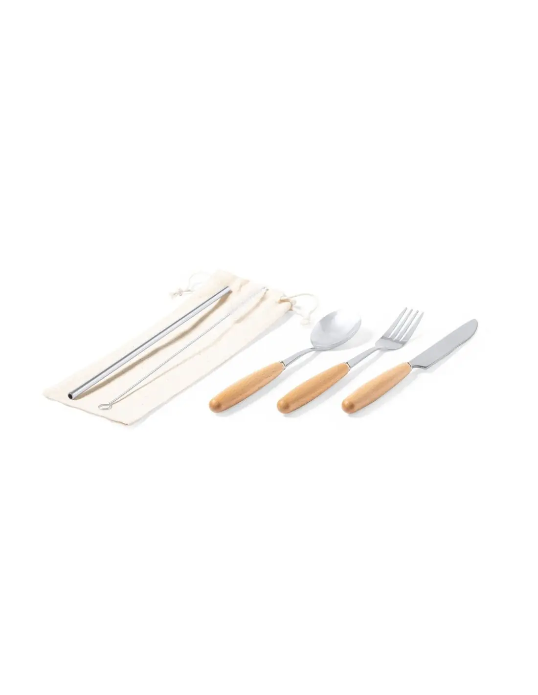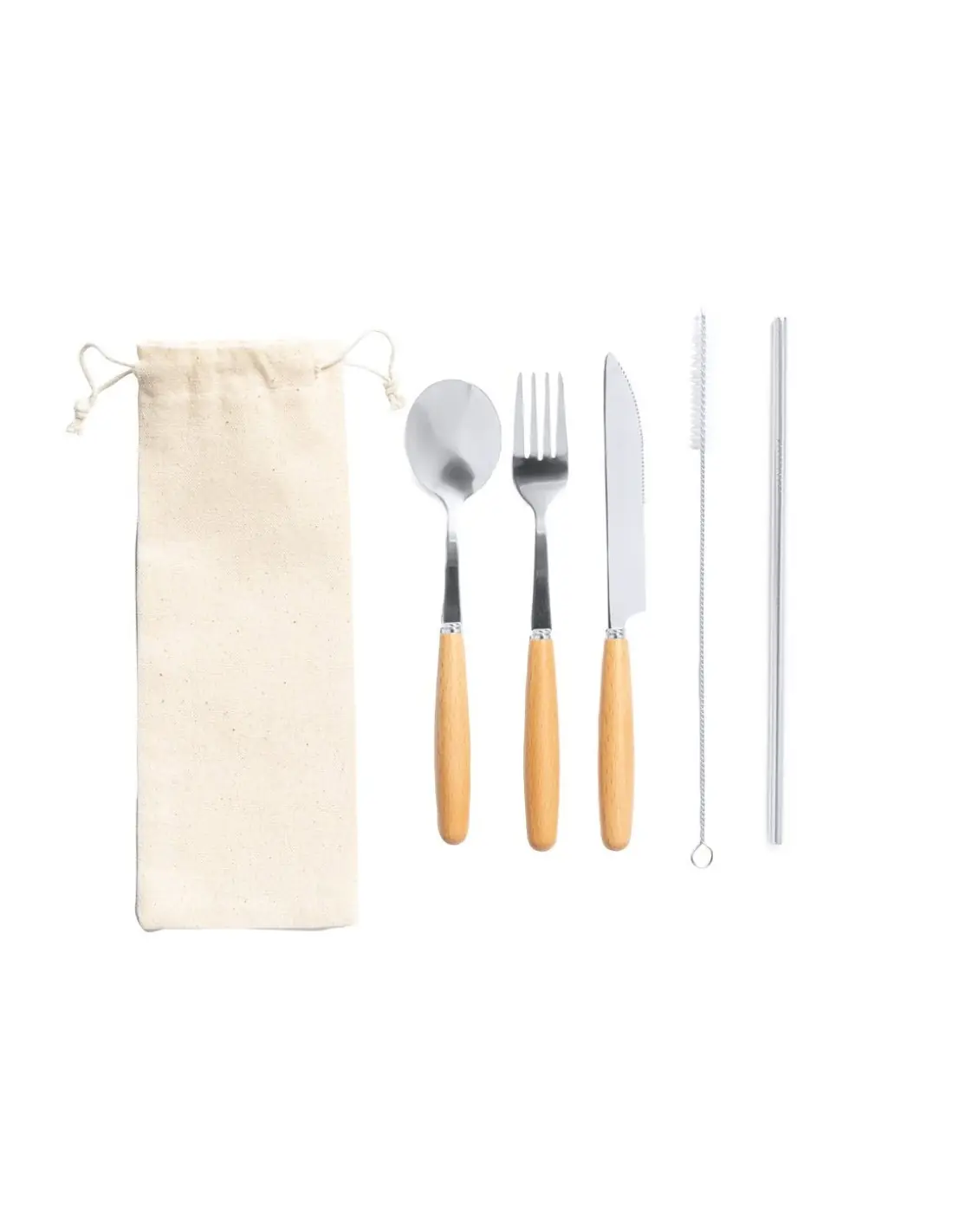 Set de cubiertos de 5 piezas fabricados en acero inox, con mango en madera natural. Incluye cuchara, tenedor, cuchillo, pajita reutilizable y cepillo limpiador para la pajita. Presentación en funda de algodón natural con cordón de cierre.