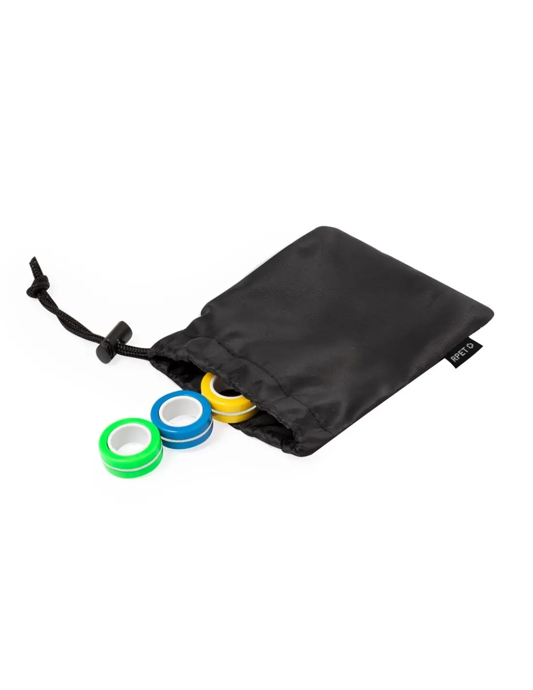 Original antiestrés en forma de anillos. Cuenta con cuatro piezas de colores con imanes para poder juntar y separar tantas veces como se quiera, liberando tensión gracias a su característico movimiento circular. Además, ofrecen la posibilidad de usarlos como spinner, ya sea juntos o por separado. Presentado individualmente en bolsa reciclada de RPET.