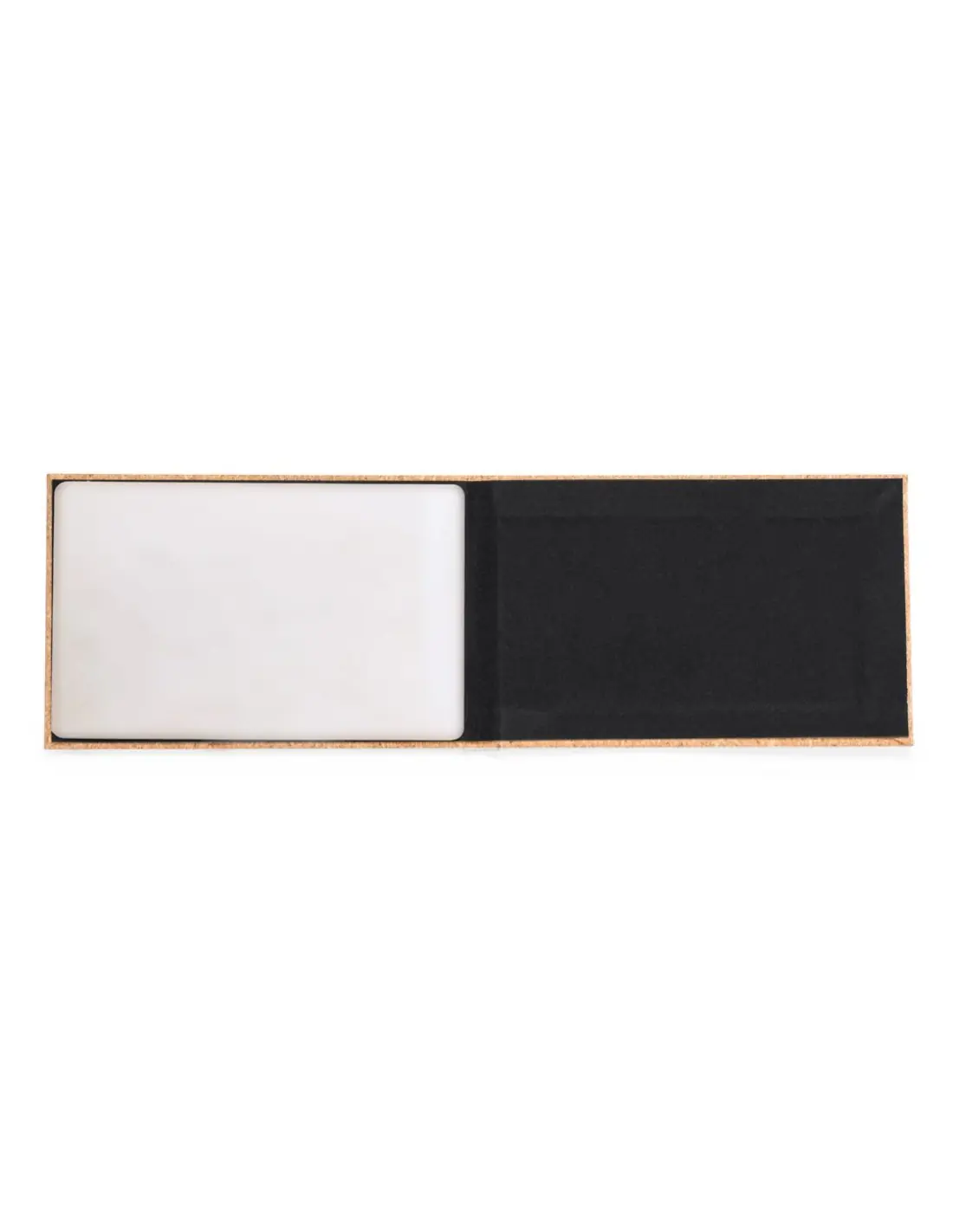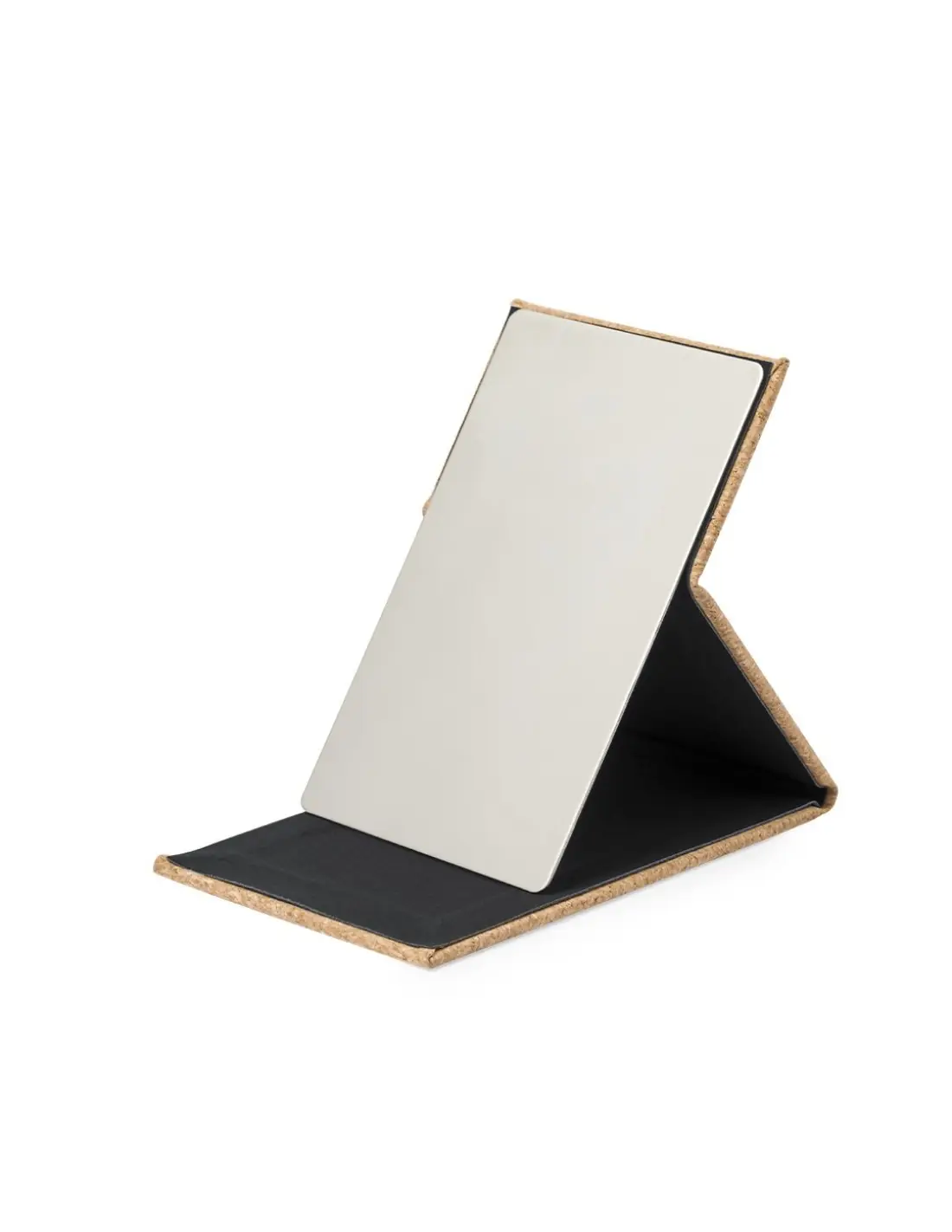 Espejo plegable 1X fabricado en corcho. Práctico espejo portátil recubierto de suave corcho con solapa para proteger el cristal y función de soporte para apoyarlo cómodamente. Presentado en una caja individual de diseño kraft.