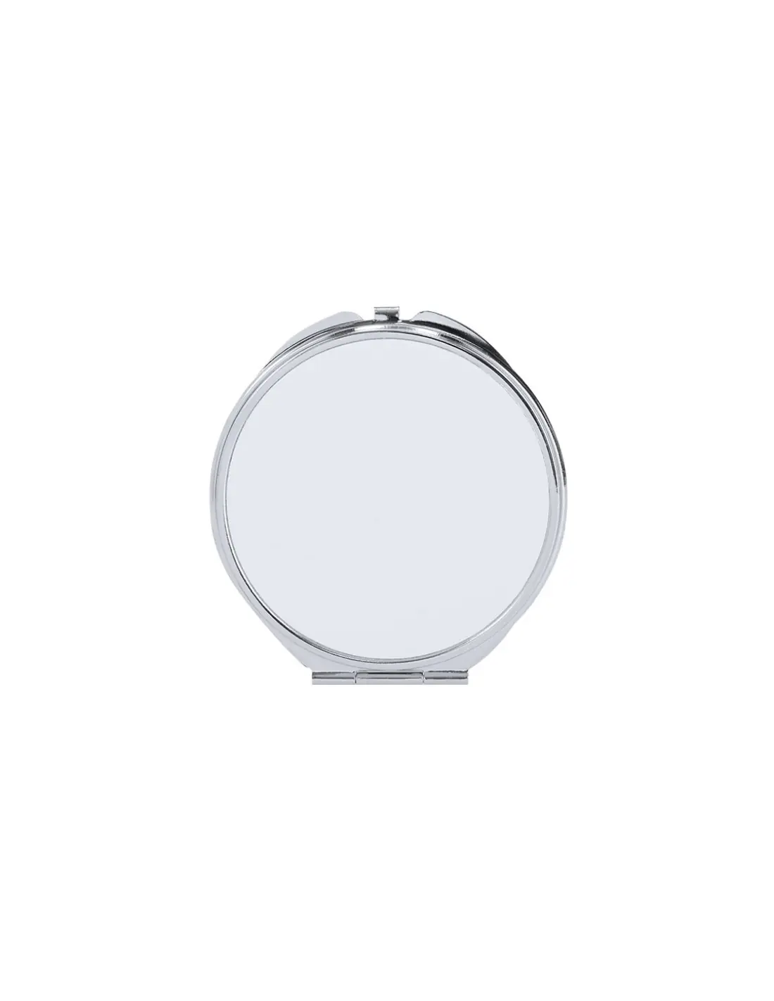 Espejo plegable metálico con placa para sublimación (no integrada en el producto, ideal para imprimir y pegar posteriormente). Con dos espejos interiores: 1X y aumento 2X.