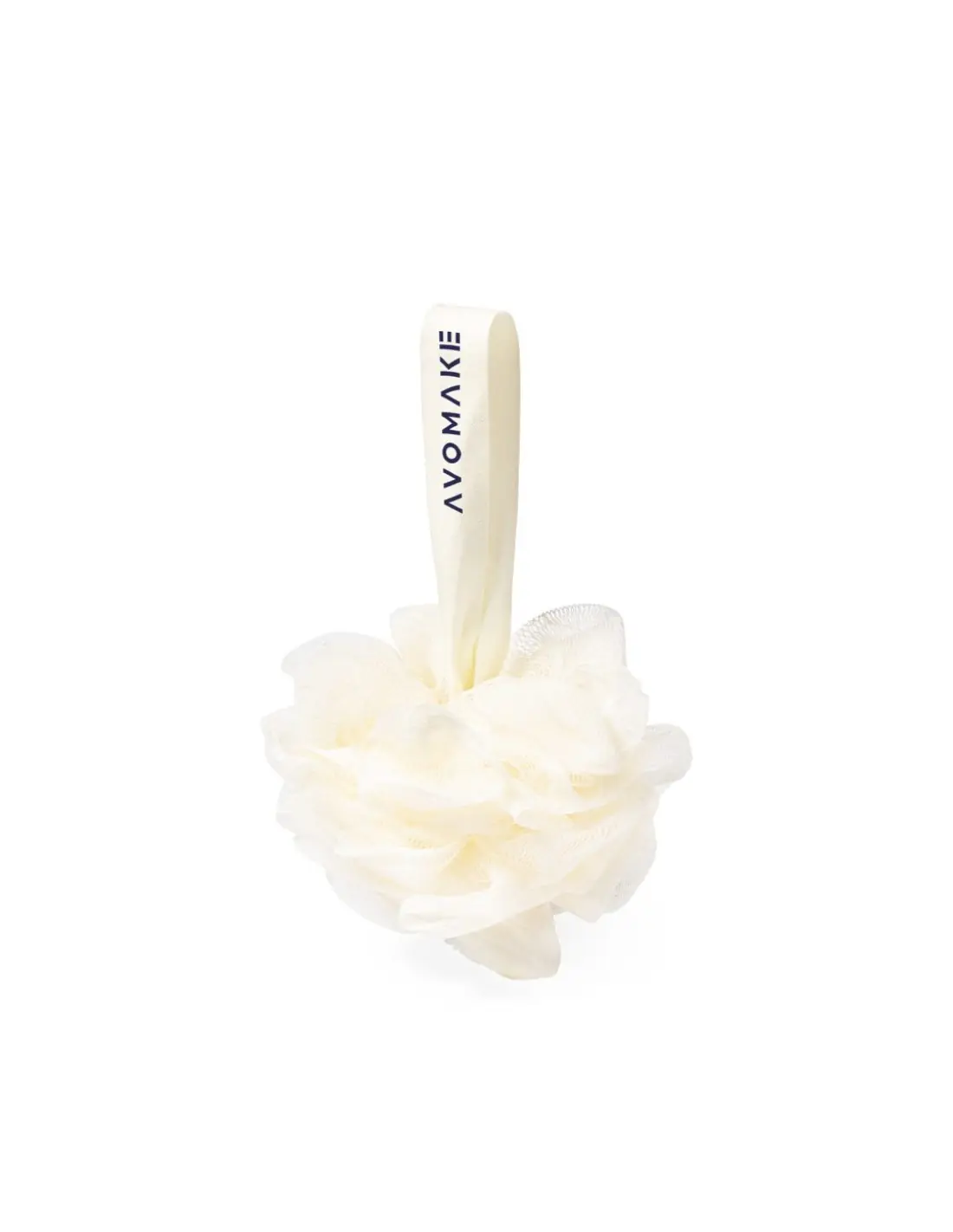 Suave esponja de baño en fibra de PE, con cinta de sujeción a juego y amplia superficie de marcaje.