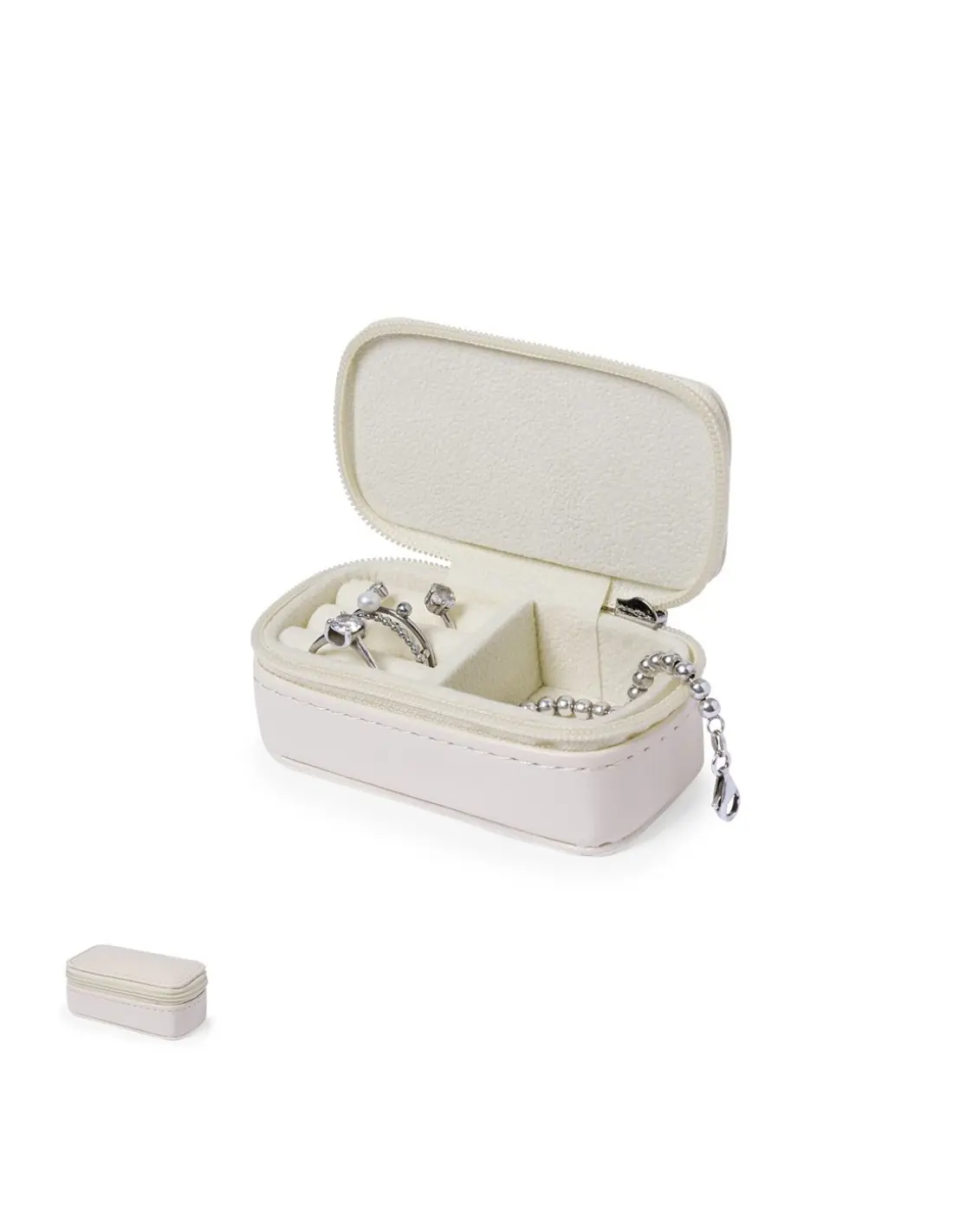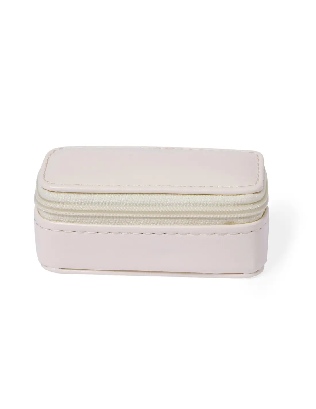 Estuche joyero fabricado en polipiel. Diseño de color natural con cierre de cremallera y dos compartimentos en su interior. Un compartimento en forma de cajita y otro compartimento con almohadillas para sujetar anillos y pendientes, forrado de suave tela. Presentado en una bolsa de papel individual.