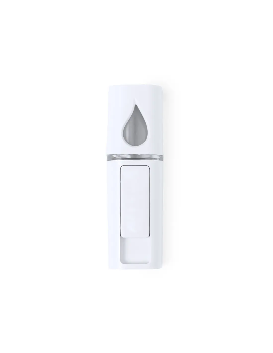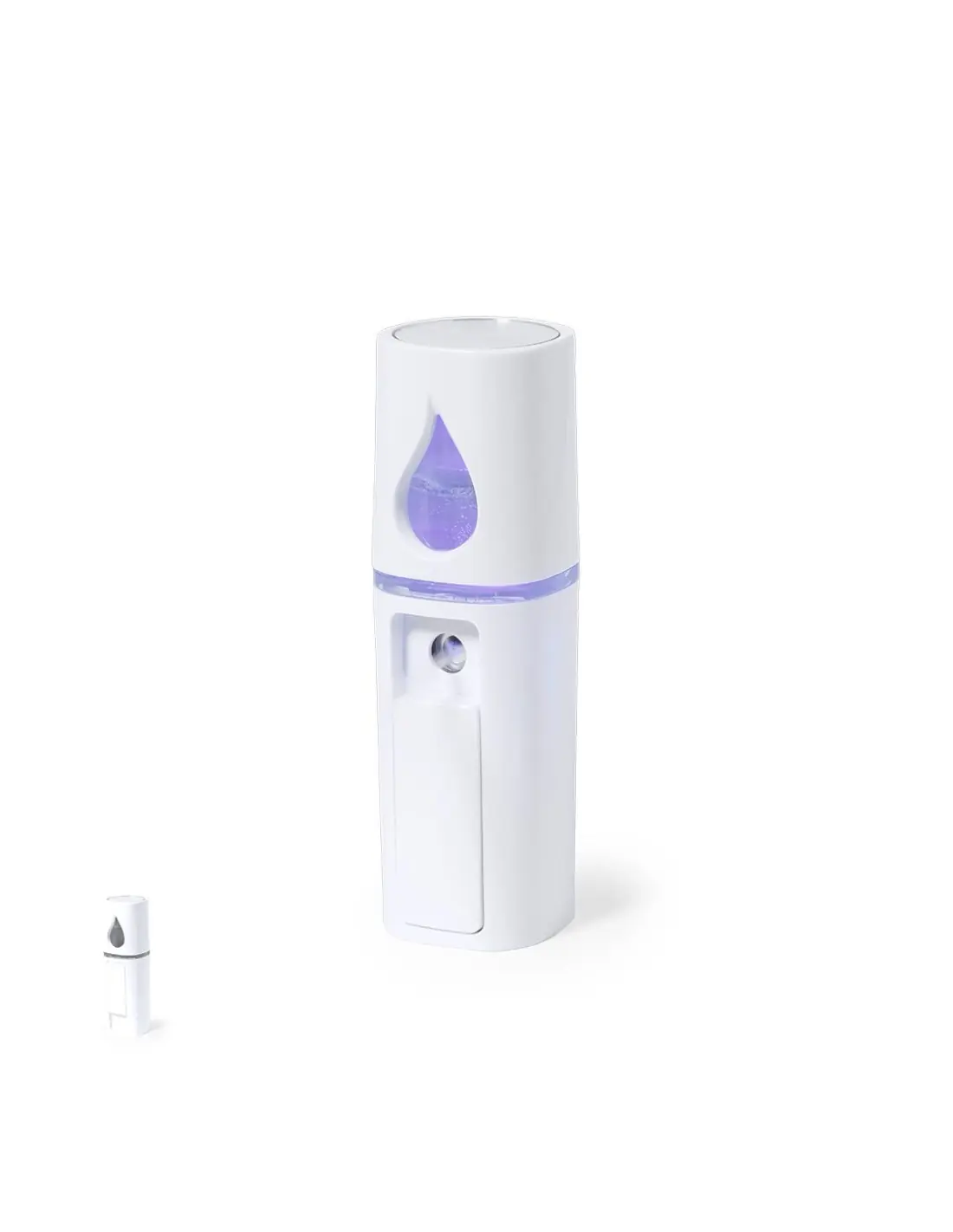 Fantástico vaporizador de bolsillo. Refrescante e hidratante pulverizador eléctrico crea una ligera bruma para rociar sobre la piel deslizando la tapadera protectora. Contenedor de 15 ml recargable con tapón de rosca, indicador de nivel y elegante luz morada. Con espejo en la tapadera. Funciona con batería de 250 mAh, cable incluido. Presentado en una caja individual.