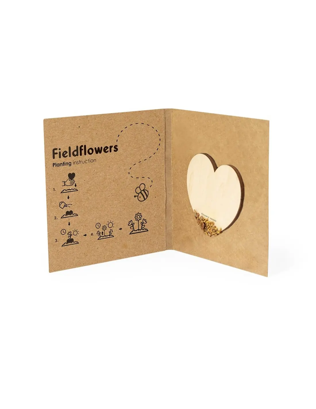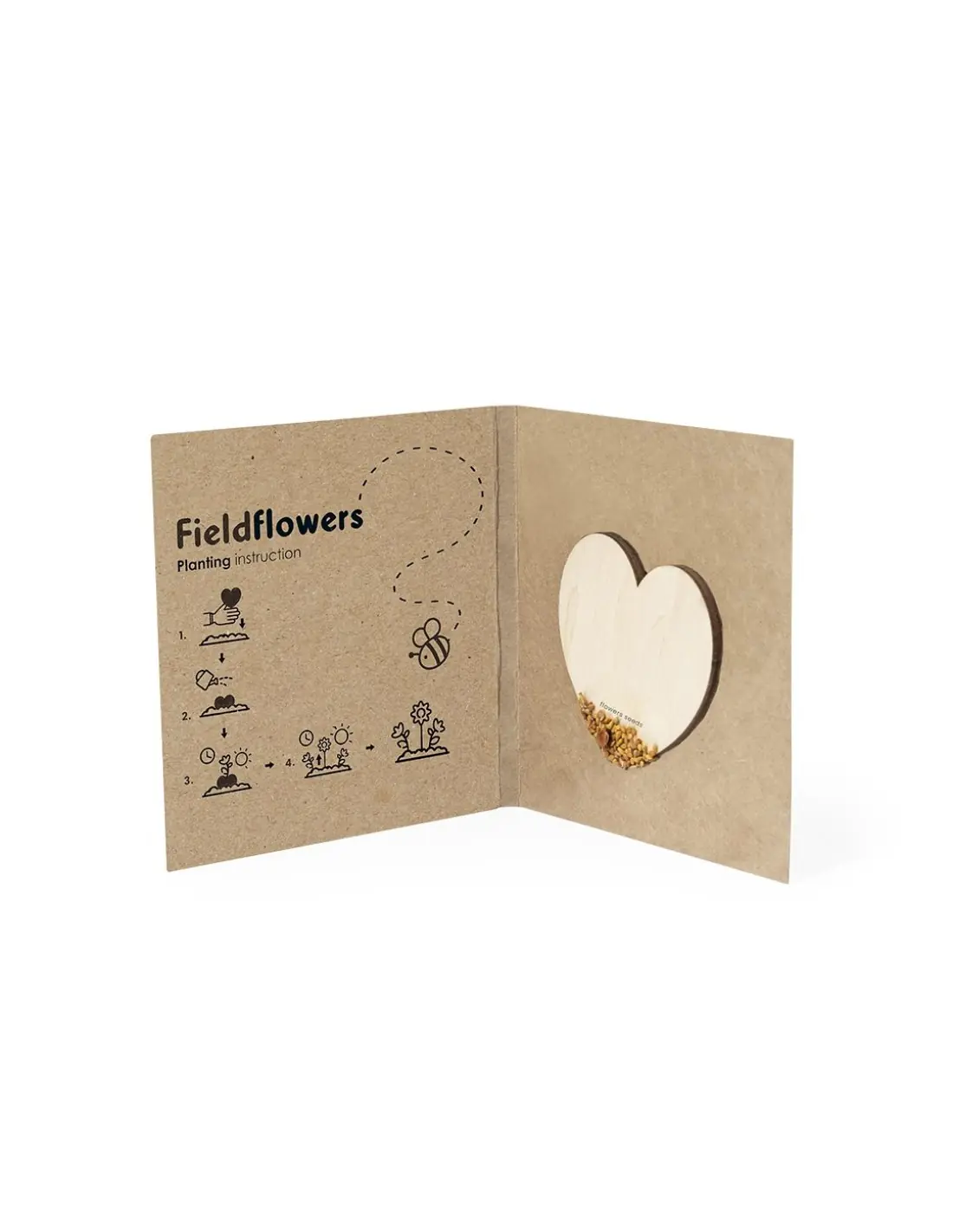 Corazón de semillas fabricado en madera natural, con semillas de flores silvestres listas para plantar. Presentado en una elegante tarjeta de cartón reciclado, con instrucciones de plantado y amplia superficie de marcaje.