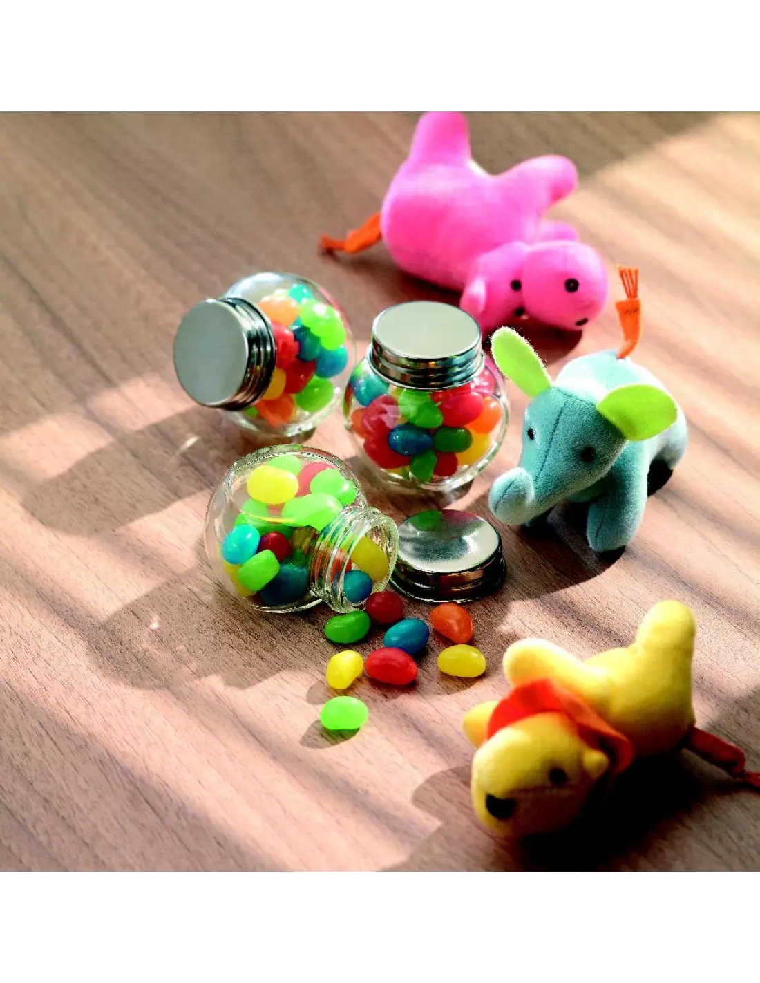 Bote de cristal con caramelos de colores y tapa de metal. 40 gramos de caramelos.
