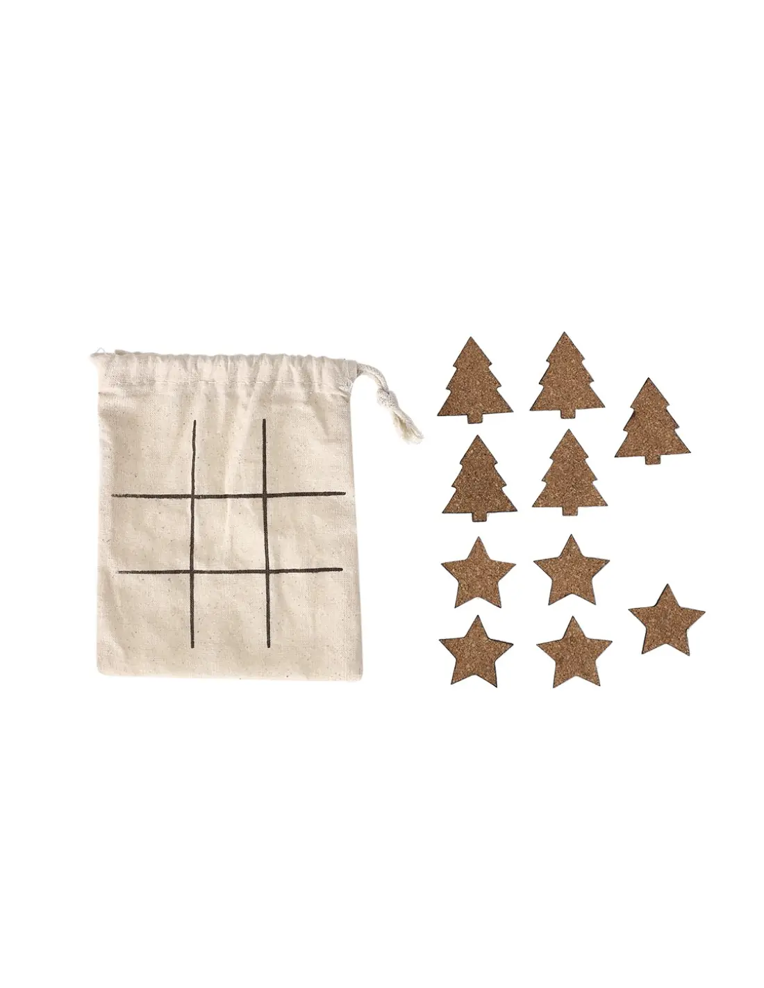 Juego de tres en raya fabricado en corcho natural. Incluye 5 fichas con forma de árbol y 5 fichas con forma de estrella. Presentado en bolsa de algodón con cierre de cordón, facilitando su almacenamiento y convirtiéndose en tablero de juego.Elaborado con elementos vegetales para así fomentar la utilización de materias primas naturales y reducir las emisiones contaminantes.