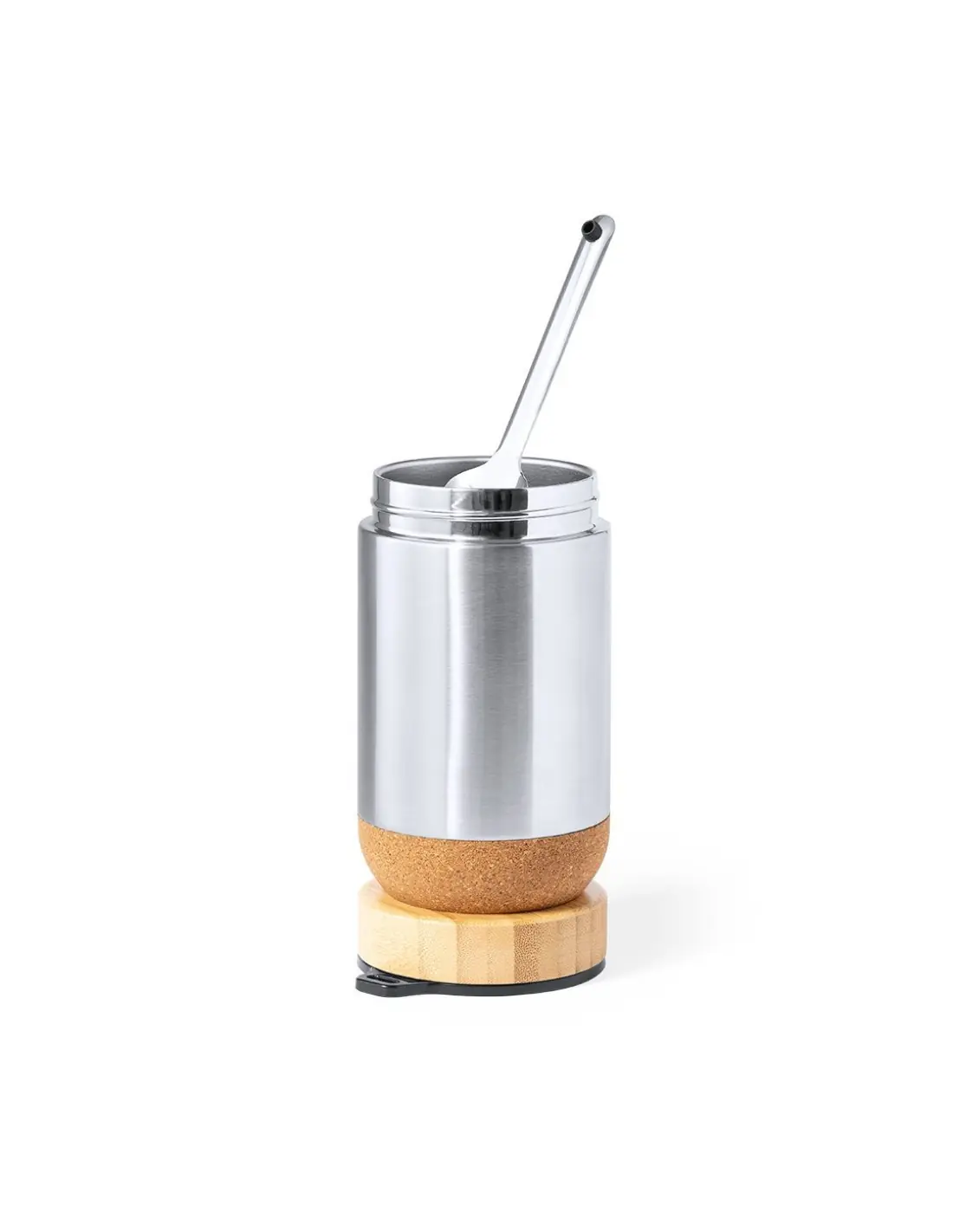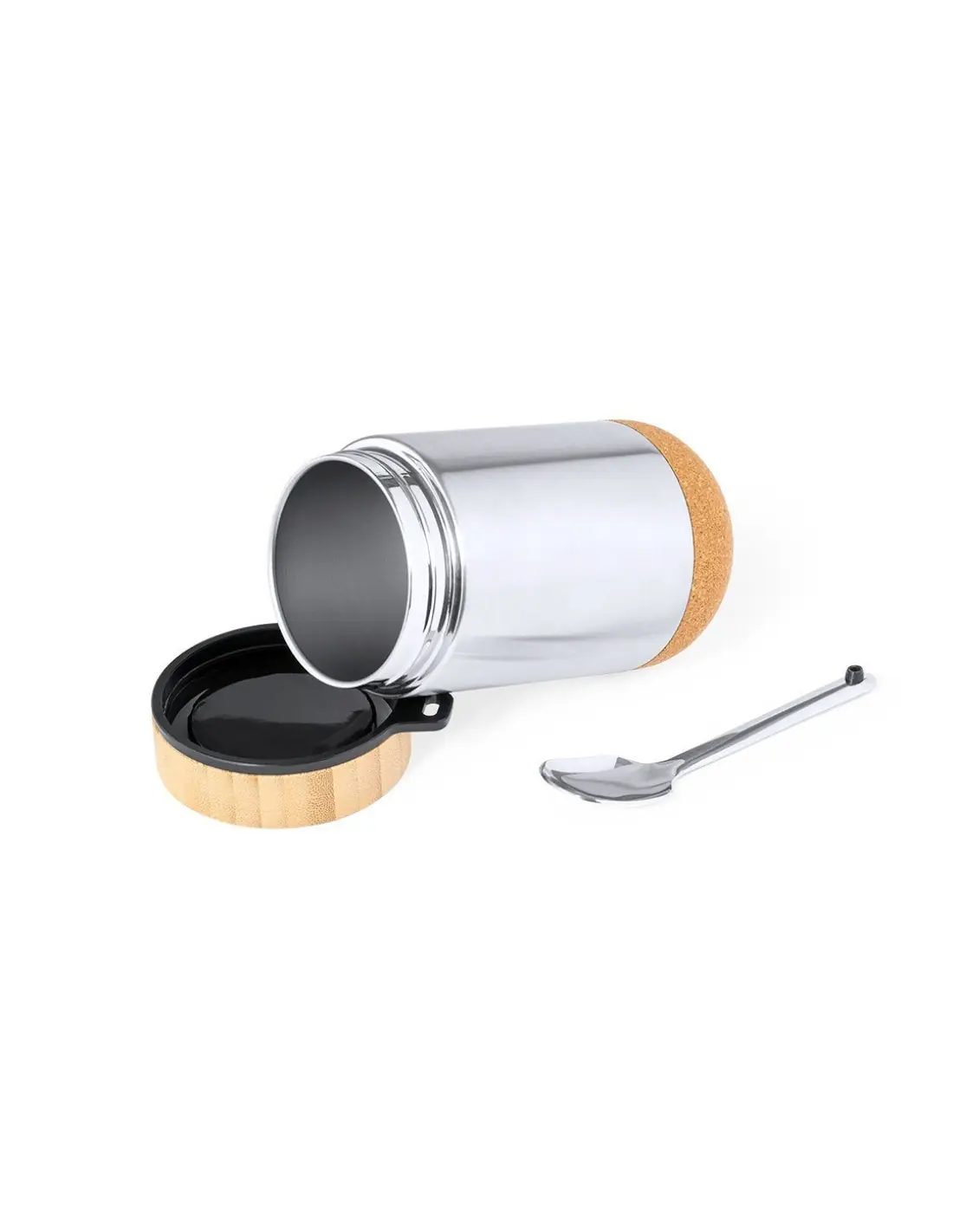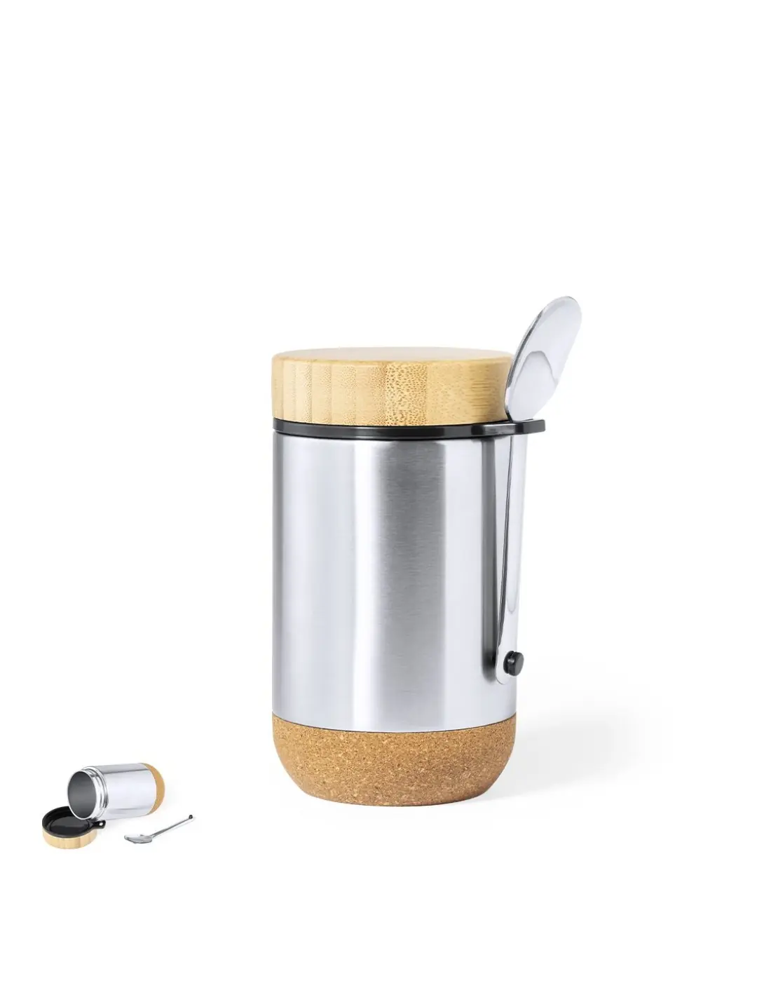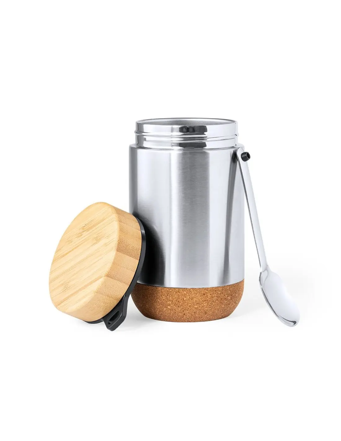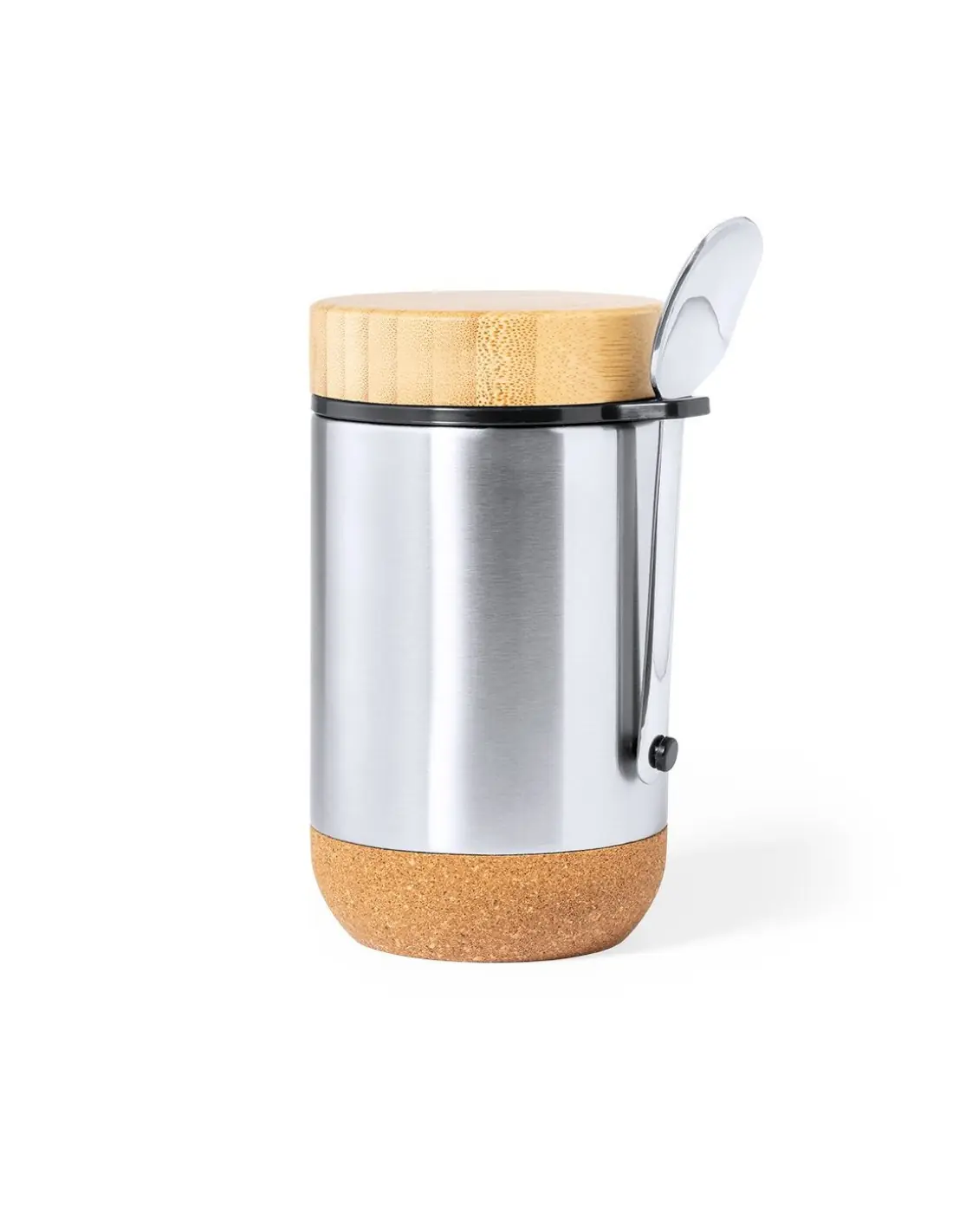 Fiambrera de línea nature y 450 ml de capacidad. Cuerpo en acero inox, con base de corcho para mantener la temperatura y tapón de seguridad en bambú, con accesorio de fijación para la cuchara de acero inox (incluida). Presentada en caja individual de diseño eco en cartón kraft.