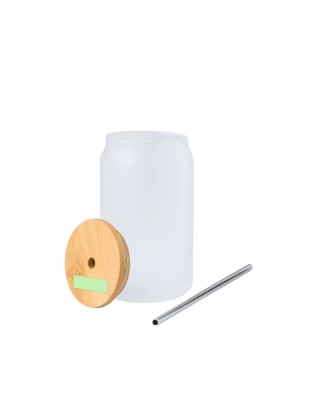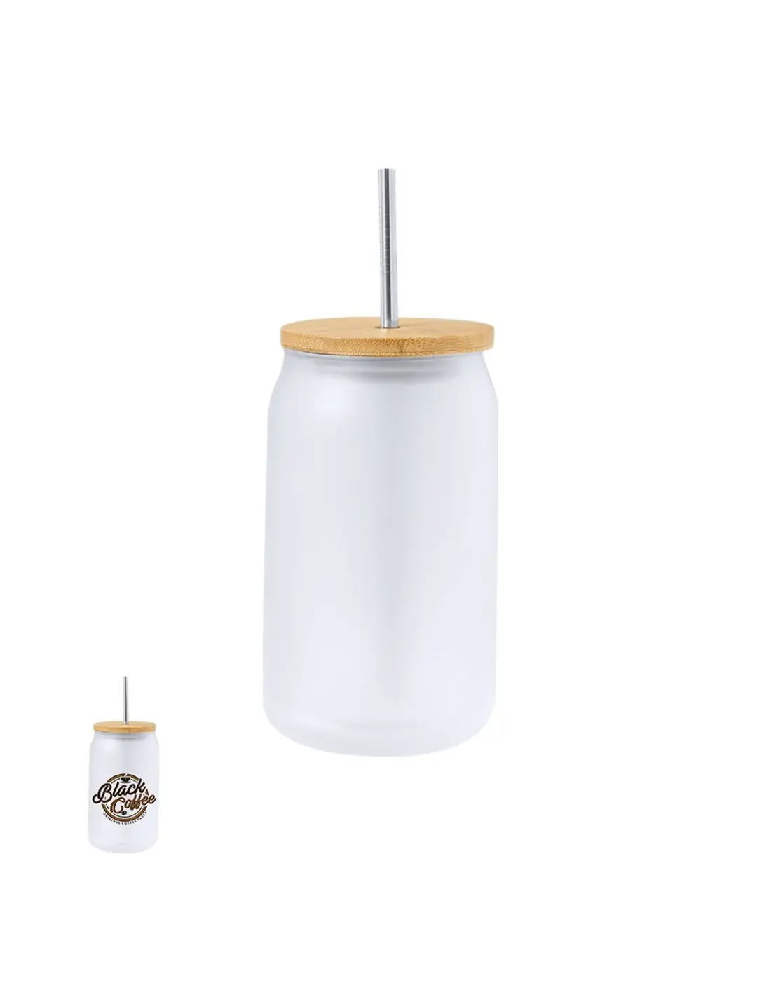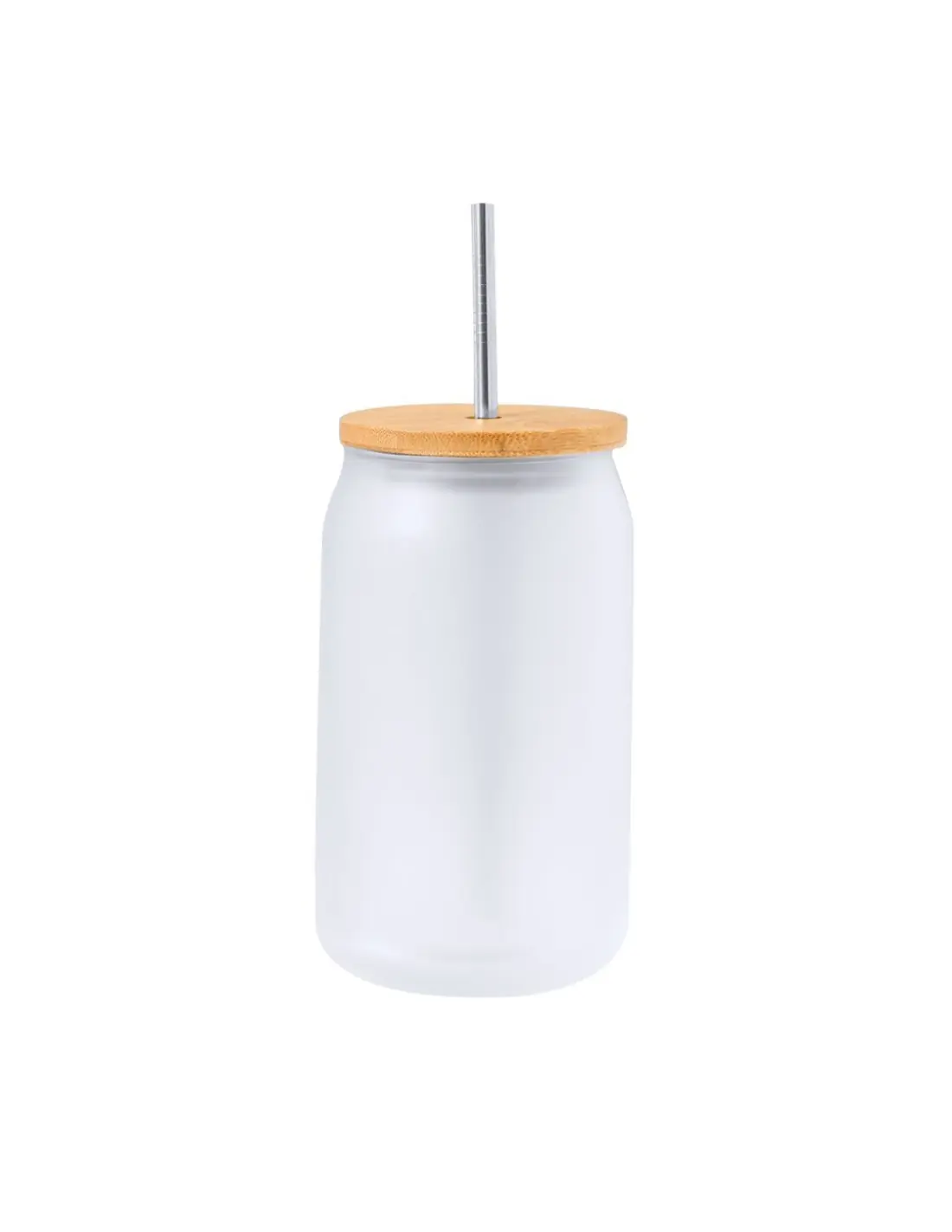 Tarro de sublimación con cuerpo fabricado en resistente cristal mate, con 400 ml de capacidad. Tapa en bambú a presión con orificio para pajita...