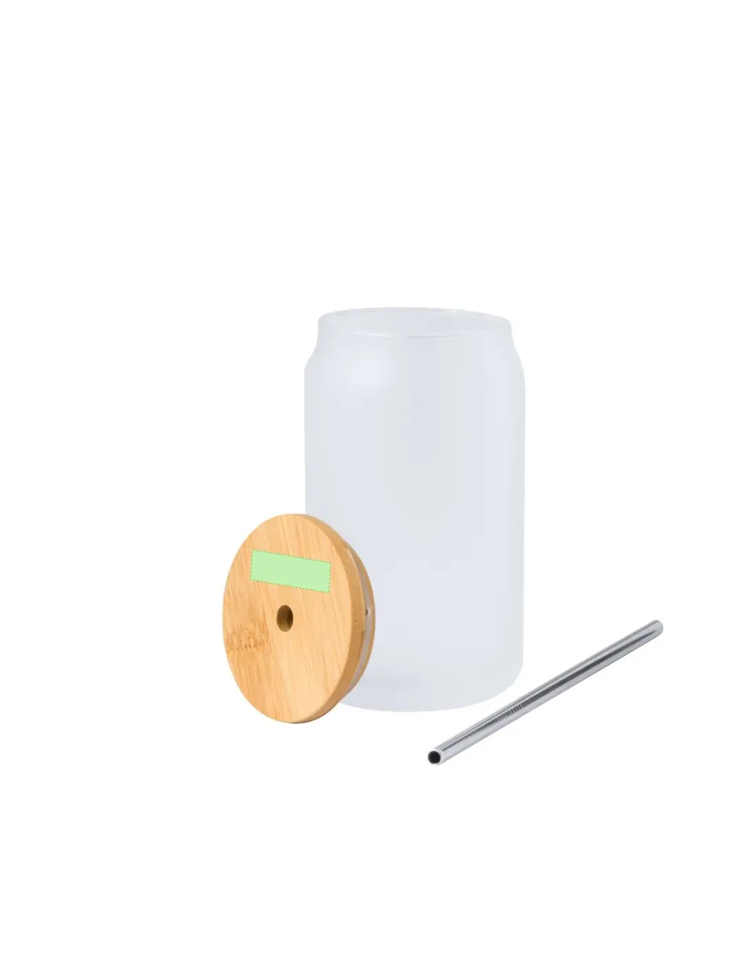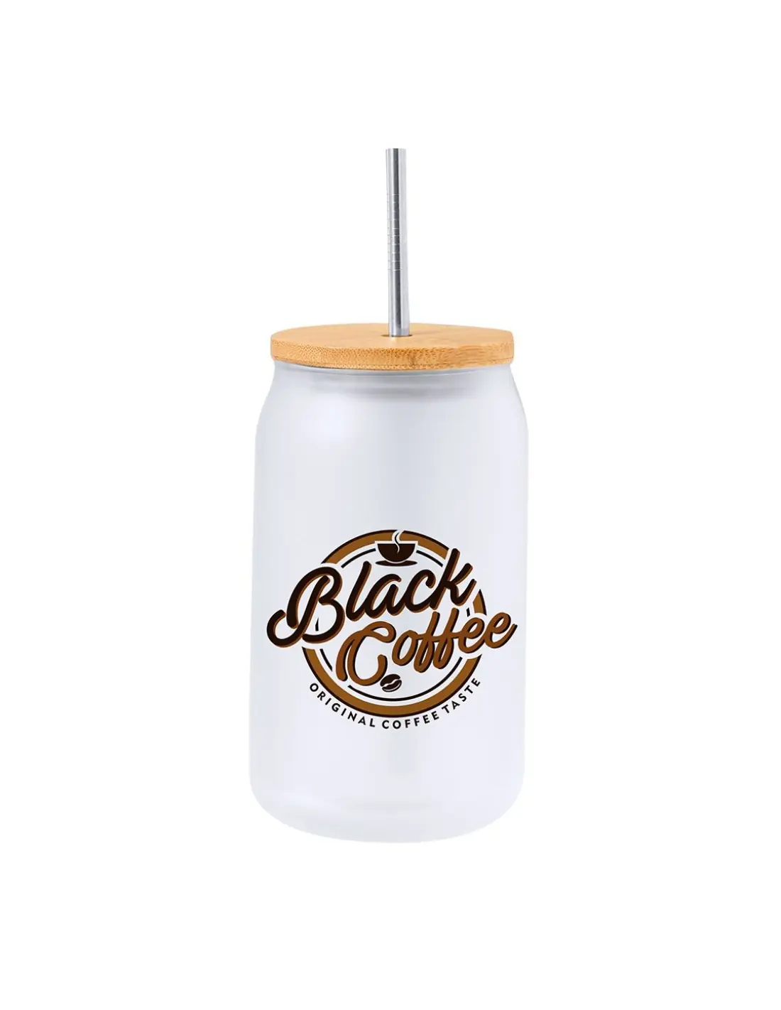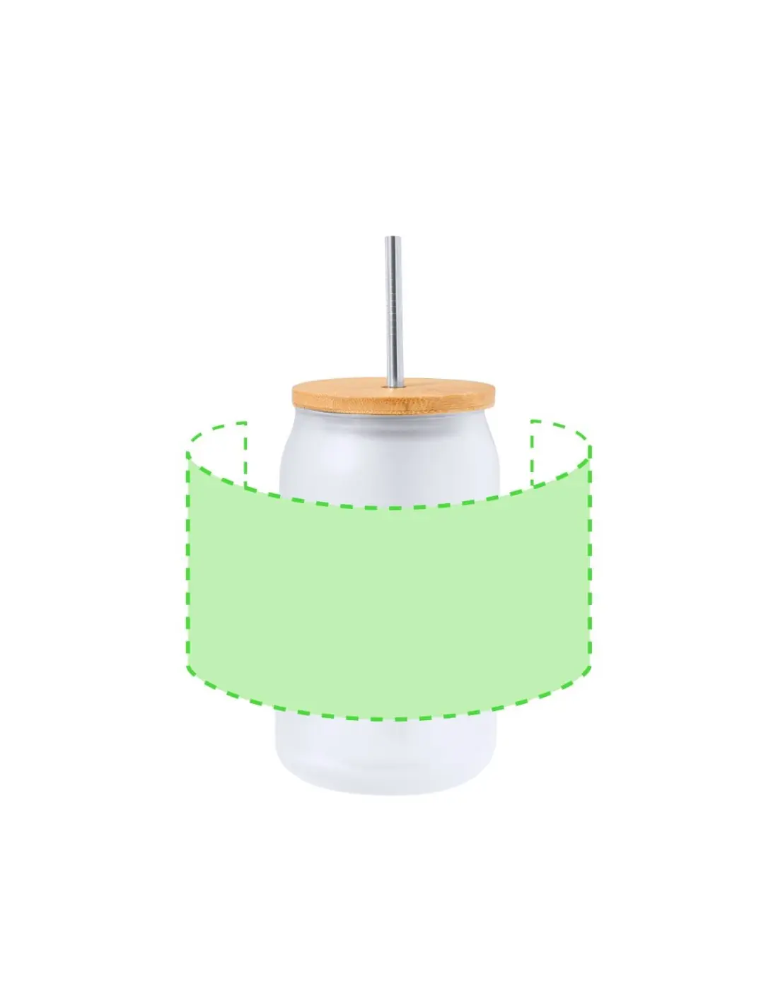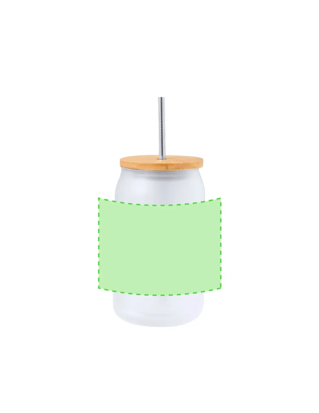 Tarro de sublimación con cuerpo fabricado en resistente cristal mate, con 400 ml de capacidad. Tapa en bambú a presión con orificio para pajita (pajita incluida y fabricada en acero inox). Especialmente diseñada para marcaje en sublimación. Presentada en caja individual kraft.