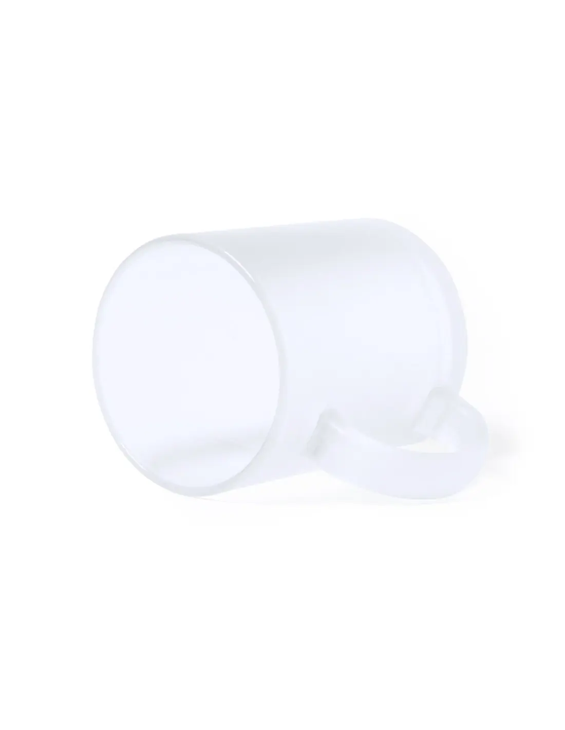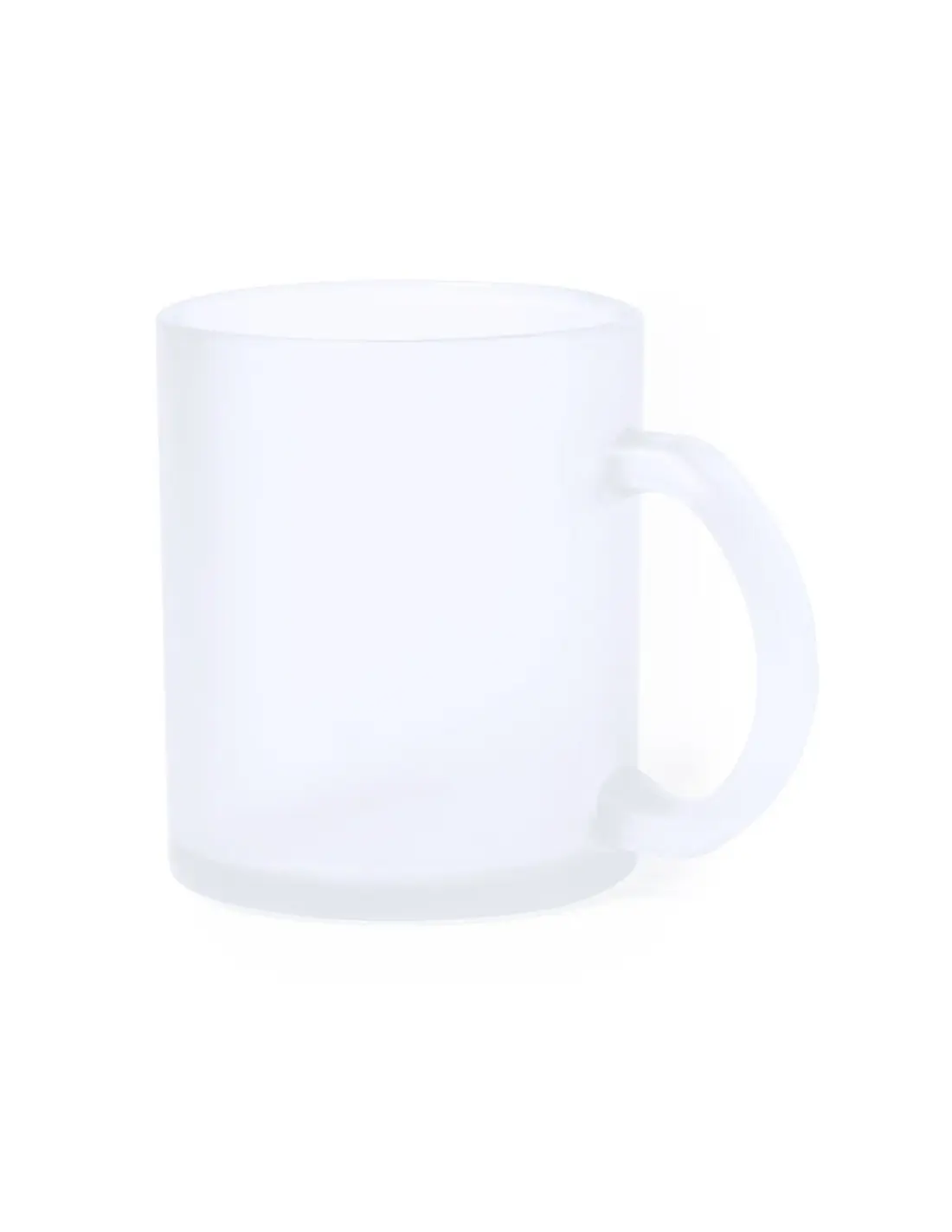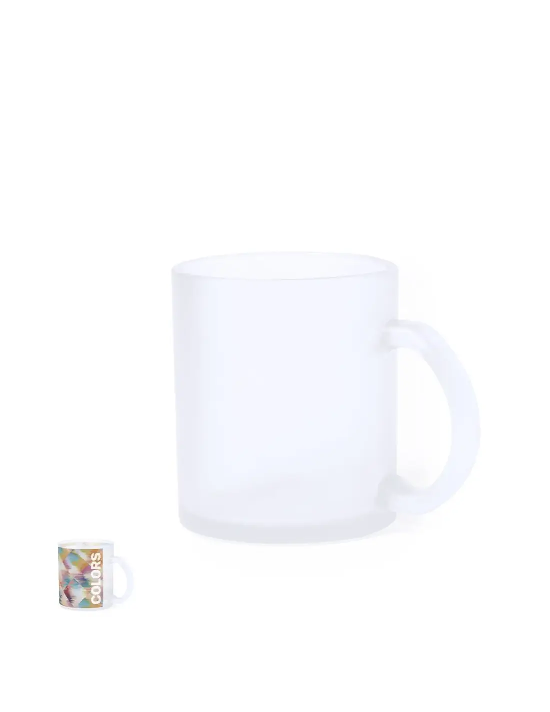 Taza de cristal de 350ml de capacidad, de acabado translúcido y especialmente diseñada para marcaje en sublimación. Presentada en caja individual de diseño kraft.