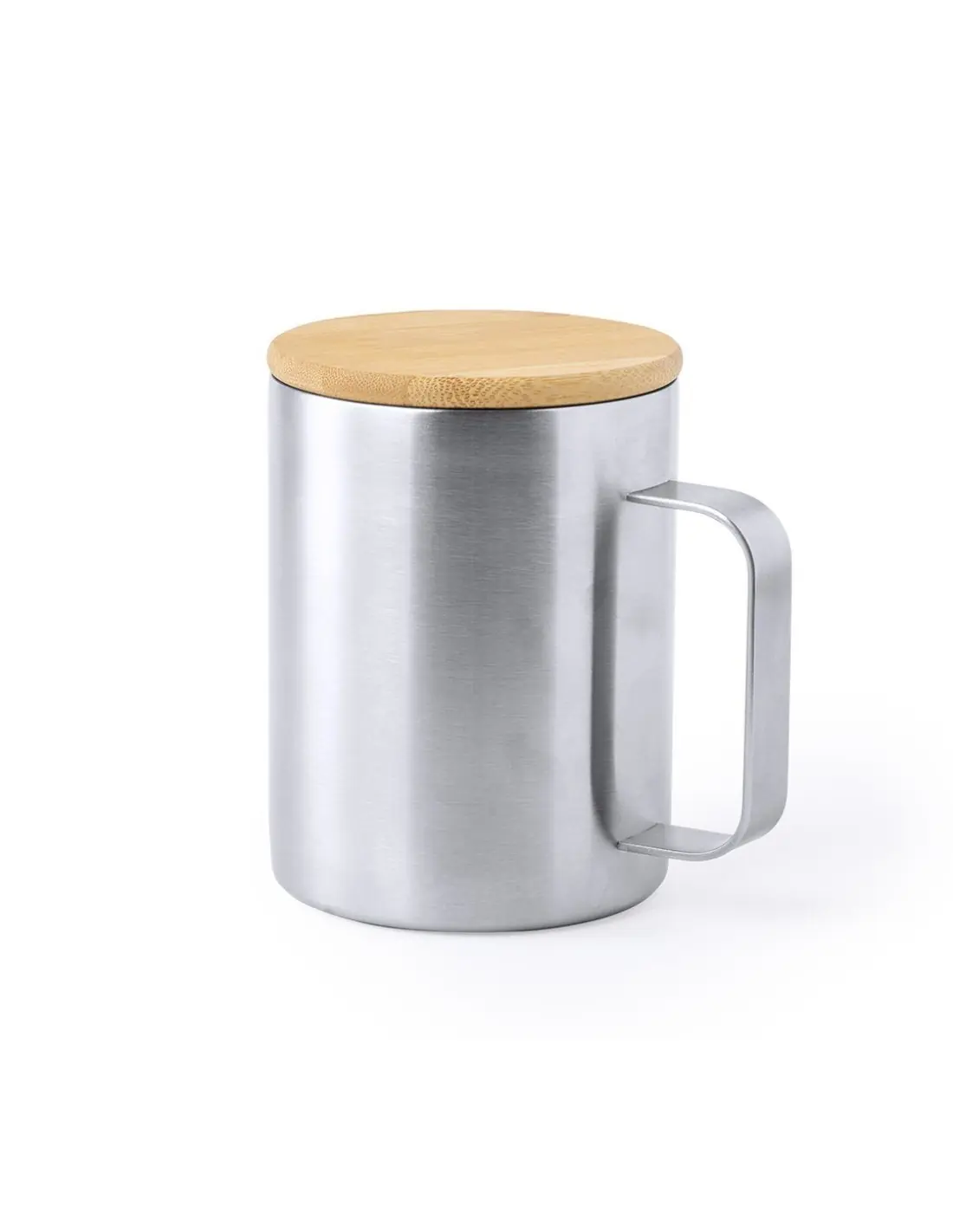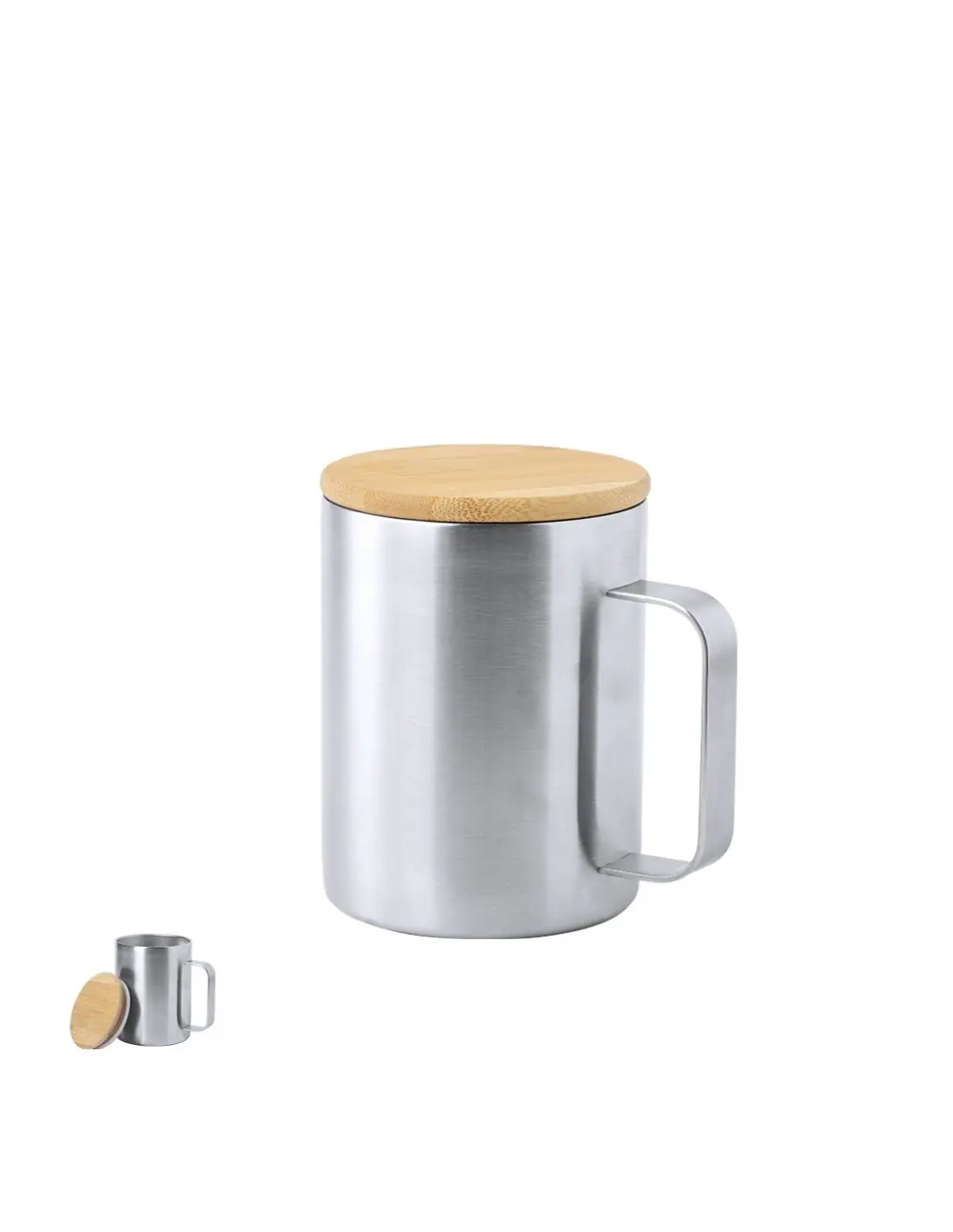 Taza de térmica de acero inox y 350ml de capacidad. Tapa fabricada en bambú y presentada en atractiva caja de diseño eco.