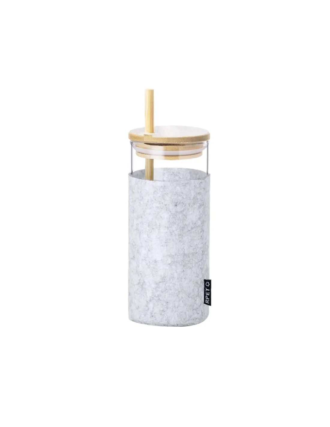 Vaso de alta calidad y 450ml de capacidad. Cuerpo fabricado en cristal de borosilicato, libre de BPA, que ofrece una resistencia y durabilidad excepcionales, alargando su vida útil y pudiendo ser reutilizado infinidad de veces. Incluye funda en suave y sostenible fieltro RPET, tapón de bambú a presión con orificio para pajita, y pajita reutilizable de bambú. Con etiqueta distintiva RPET. Presentado en caja individual de diseño eco.El fieltro RPET reciclado es fruto de la combinación del proceso de reciclaje de materiales plásticos junto a la técnica milenaria de fabricación del fieltro, dando como resultado un material de eco-tendencia que, además de ser de origen reciclado, también se convierte en reciclable.