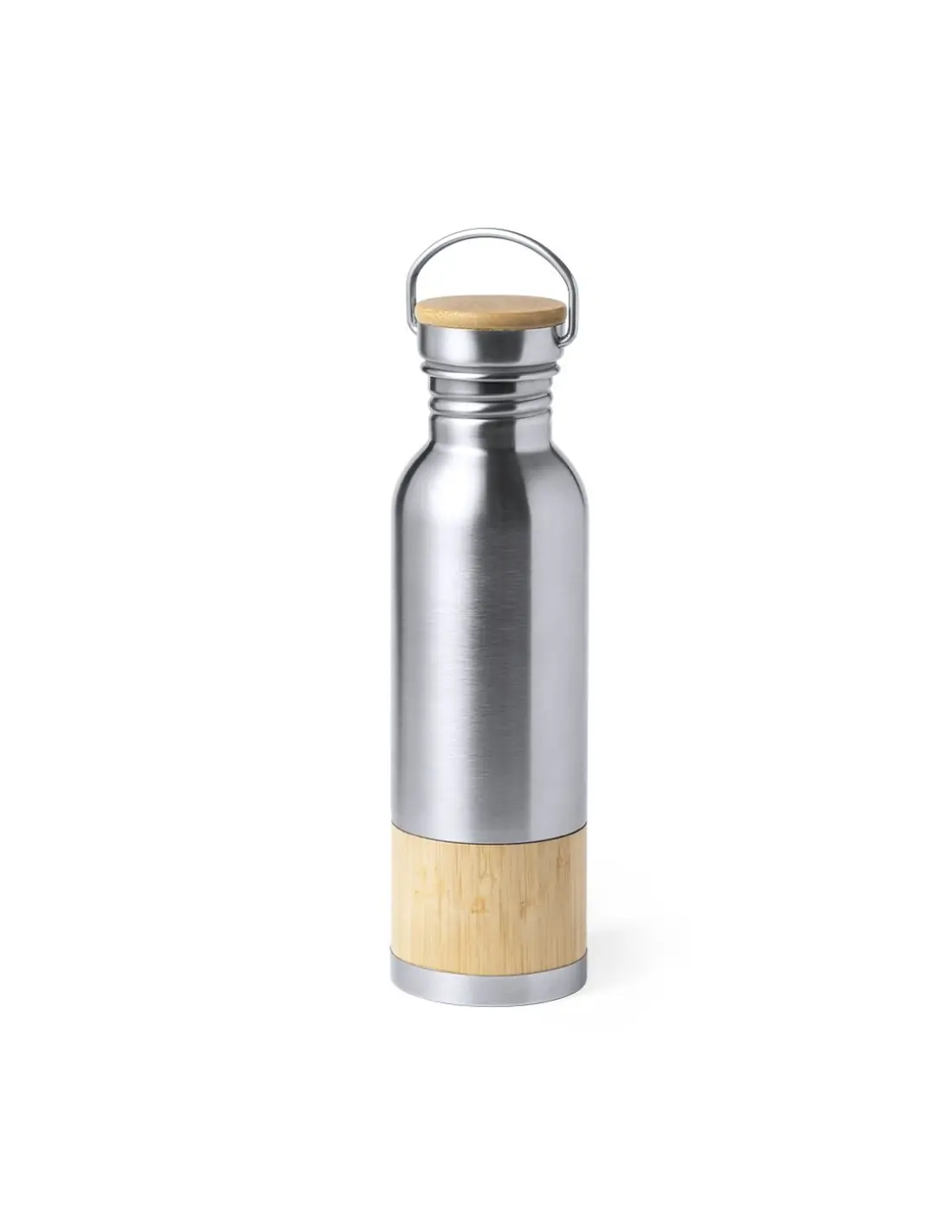 Bidón de original estilo retro y 800 ml de capacidad. Cuerpo en acero inox con franja de bambú, con tapón de seguridad a rosca en acero inox y detalle en bambú. Presentado en caja individual de diseño eco en cartón kraft.