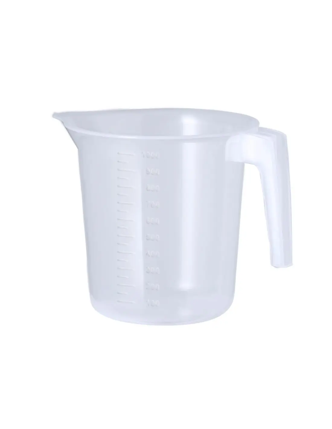 Jarra medidora de 1L fabricada en resistente PP transparente con asa. Con medidor lateral en tramos de 50 ml y vertedor en el borde para evitar derrames.