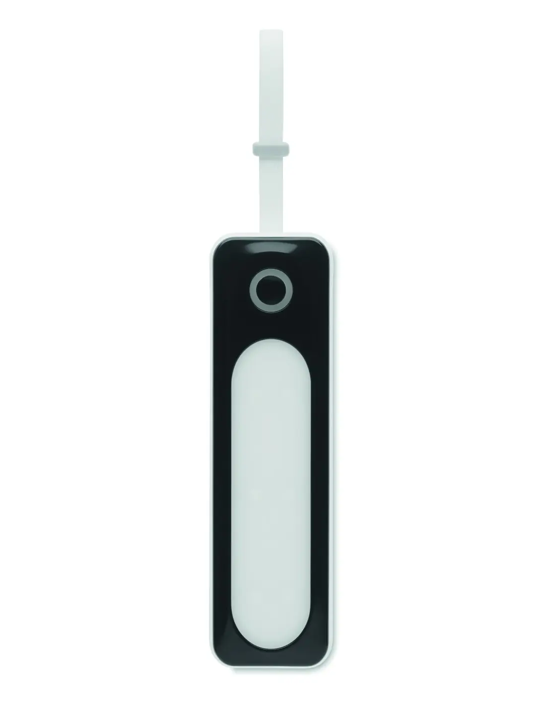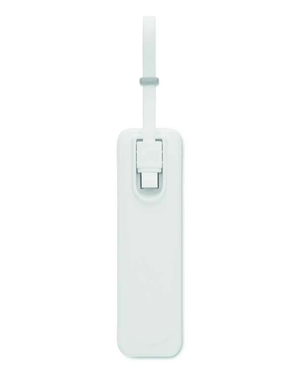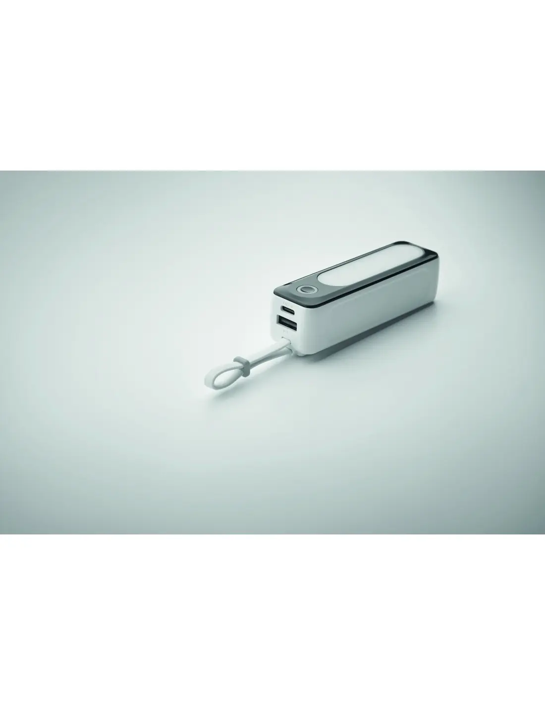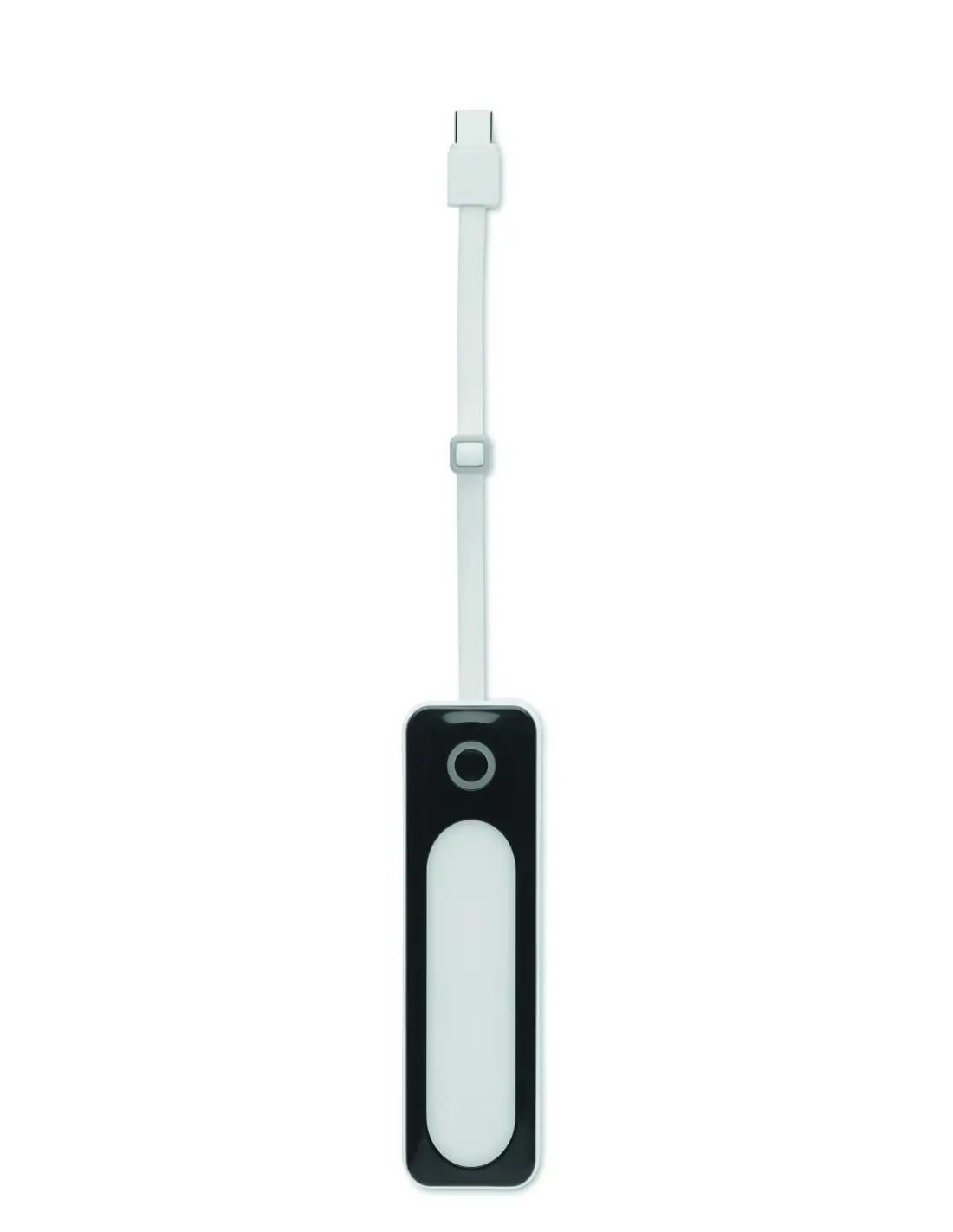 Power bank de 5000 mAh de capacidad en carcasa de abs. Corriente de salida DC5V/2A 1x tipo A y 1x tipo C in/out. Incluye indicador de 4 ajustes de luz (6 led COB) y cable USB integrado con salida de enchufe tipo C.