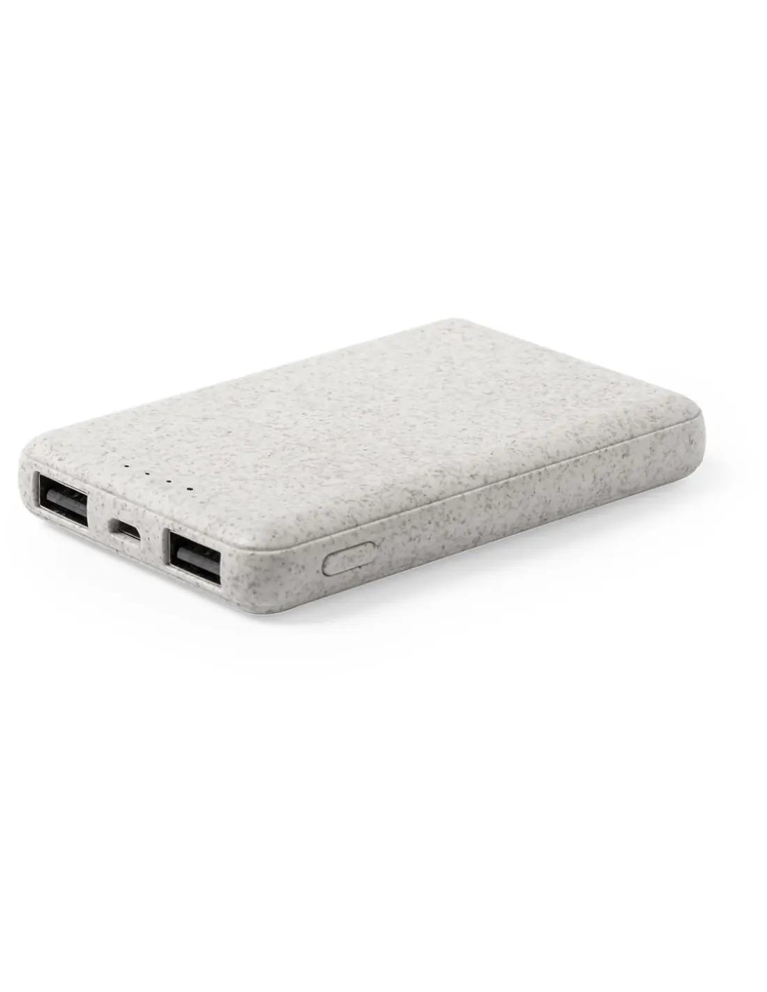 Batería auxiliar externa de línea nature de tamaño ultra compacto, con carcasa en caña de trigo, para así fomentar la utilización de materias primas naturales y reducir las emisiones contaminantes. 5.000 mAh de capacidad de carga e indicador de estado de carga. Salida USB dual para carga simultánea de 2 dispositivos y entrada micro USB -cable incluido-. Con amplia superficie de marcaje y presentado en atractiva caja de diseño eco. Las capacidades mostradas en todas nuestras baterías auxiliares externas son reales, incorporando todas ellas baterías de grado A y no recicladas, con una vida útil de al menos 500 ciclos de carga y según normativa CE. Además, están fabricadas conforme a los estándares RoHS y en cumplimiento con los siguientes requisitos de seguridad: Sistema de protección contra sobrecarga del power bank. Sistema de protección contra descarga completa que proporciona una mayor durabilidad del power bank. Sistema de bloqueo para evitar cortocircuitos. Sistema de transferencia de carga constante, acorde con la capacidad del dispositivo de destino.