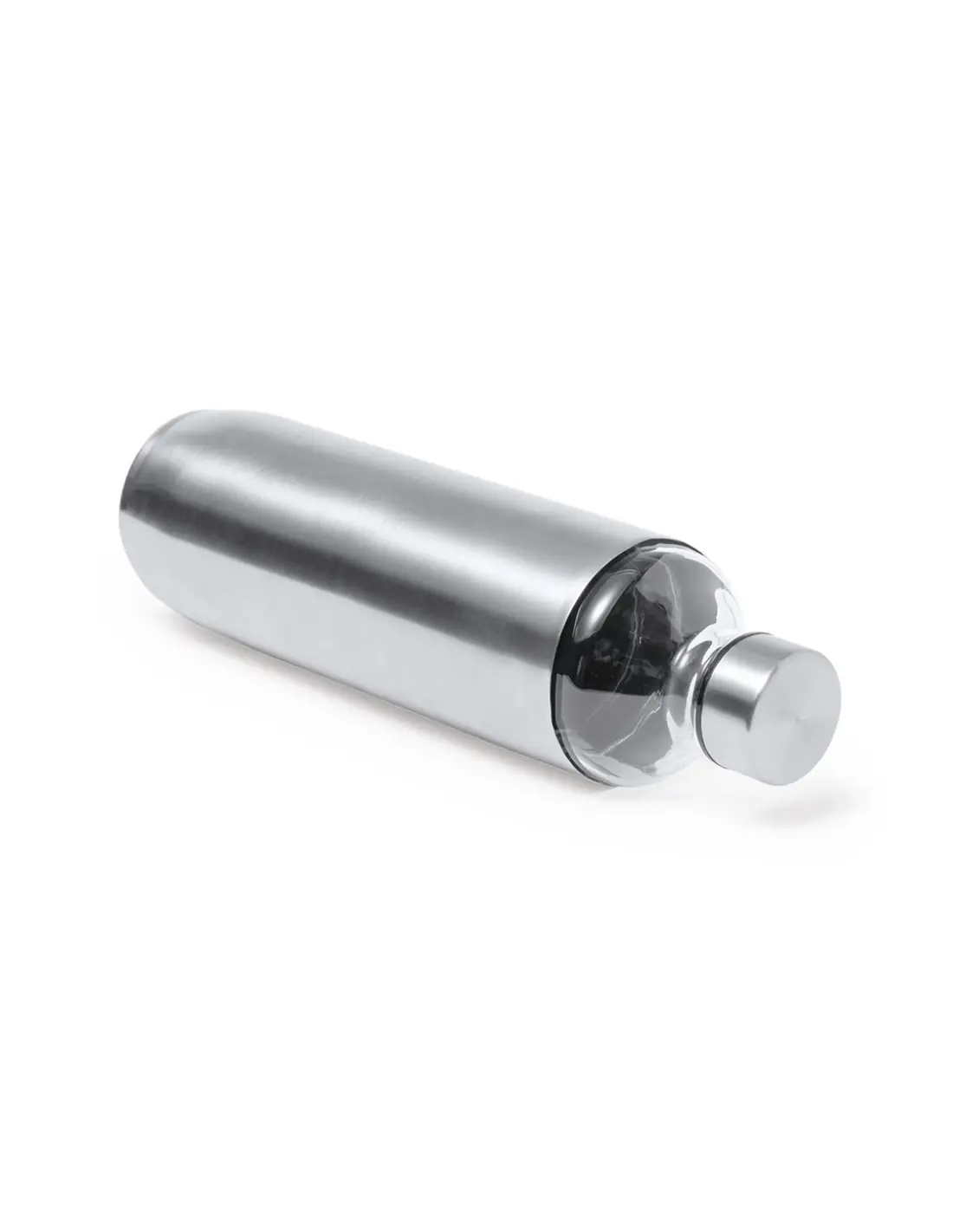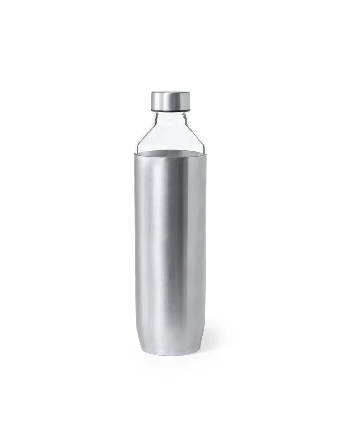Bidón de diseño en alta calidad, de 850 ml de capacidad. Fabricado en cristal de borosilicato, que ofrece una resistencia, estética y durabilidad excepcionales, alargando su vida útil y pudiendo ser reutilizado infinidad de veces. Tapón y funda del cuerpo del bidón en acero inox. Presentado en atractiva caja de diseño.