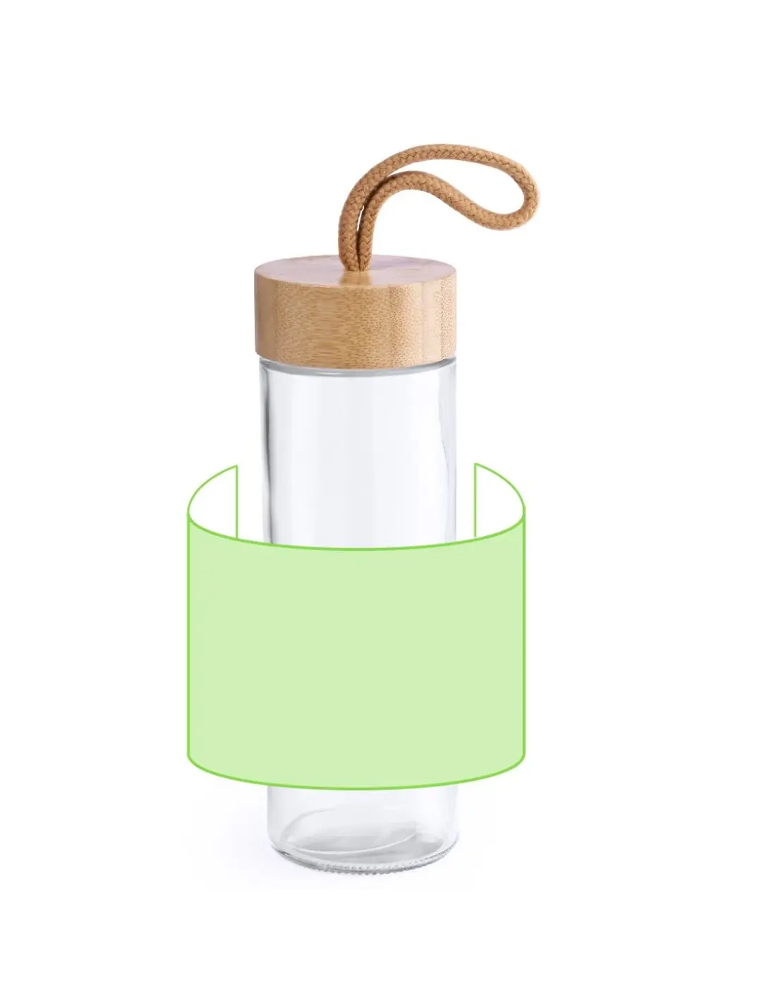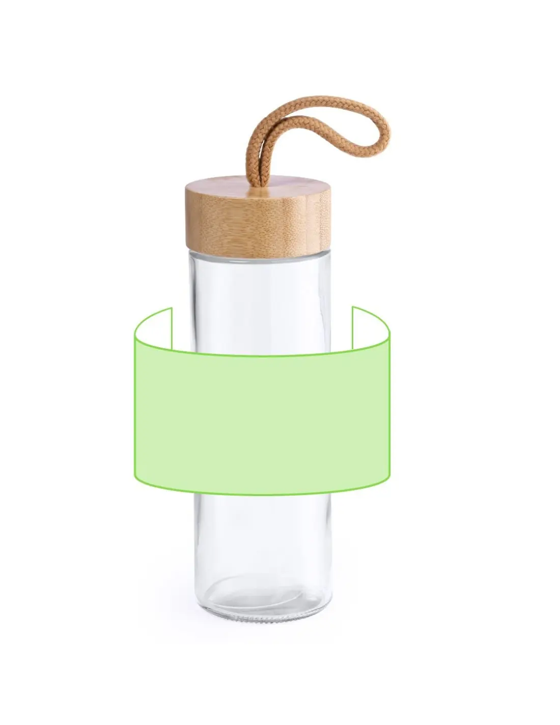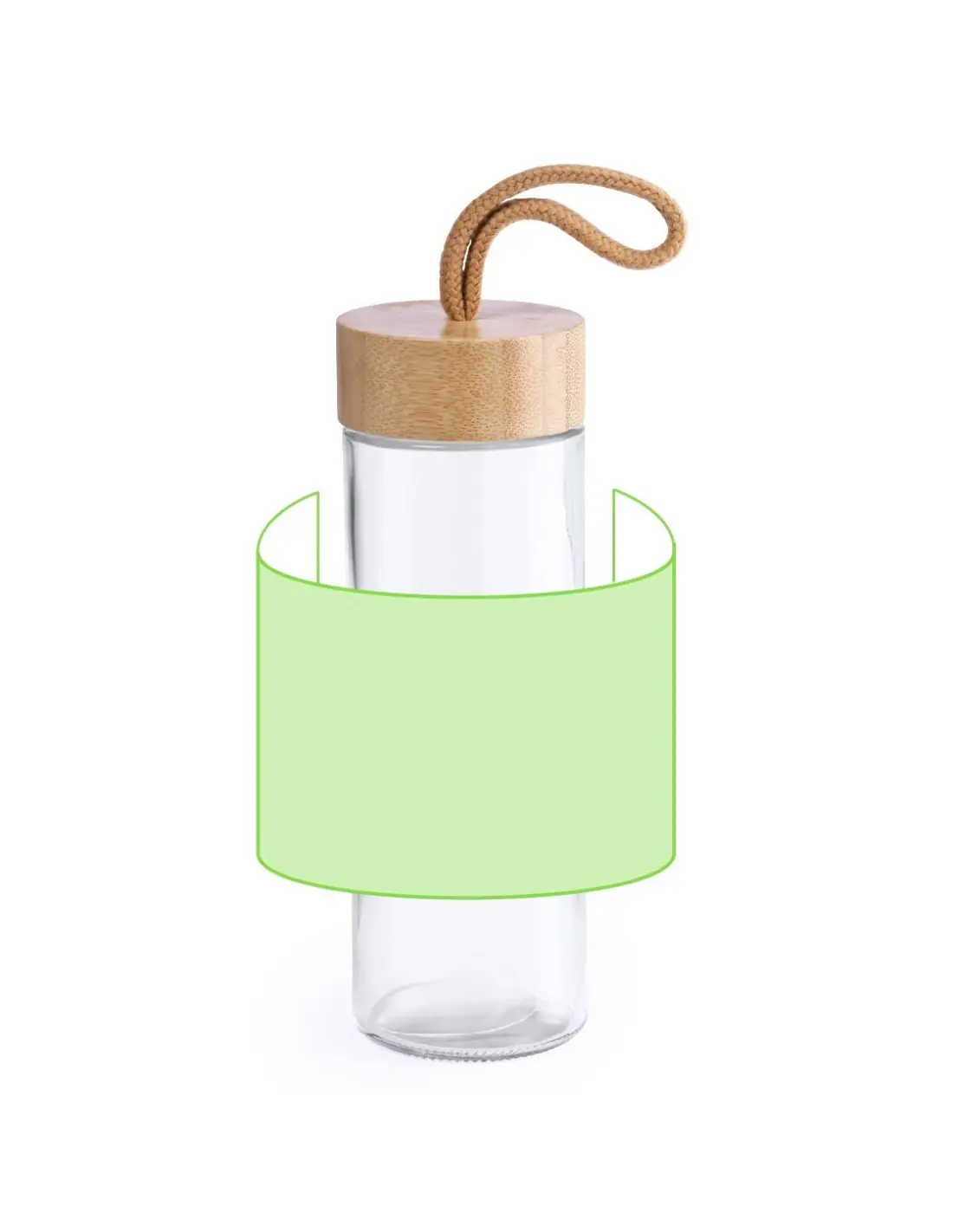Tarro de línea nature de 420ml de capacidad. Fabricado con cuerpo de cristal y tapón a rosca de bambú, con práctica asa de transporte trenzada en color natural. Presentado en caja individual de atractivo diseño.