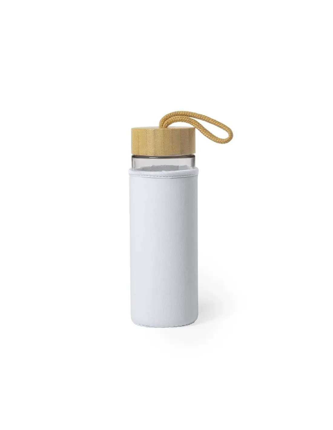 Bidón de línea nature en combinación de materiales bambú y cristal. 530 ml de capacidad, con tapón a rosca en bambú y funda en elegante color blanco....