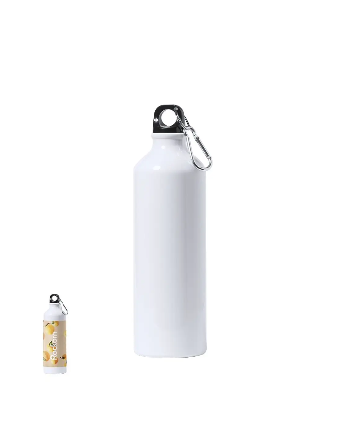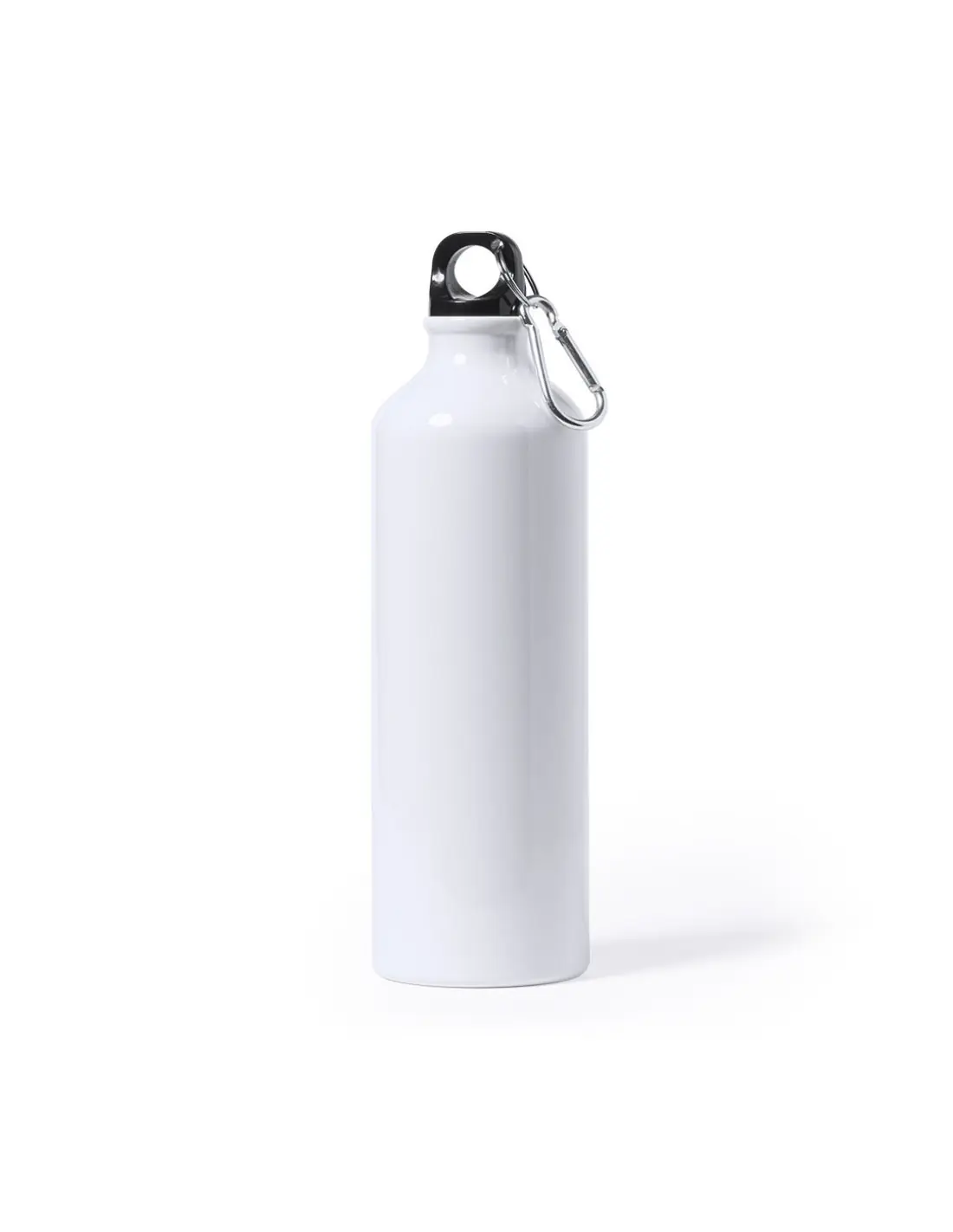 Bidón de aluminio de 800ml de capacidad. Acabado en suave y brillante color blanco, especialmente diseñado para marcaje en sublimación. Con tapón de seguridad a rosca y mosquetón metálico de transporte. Presentado en atractiva caja de diseño.